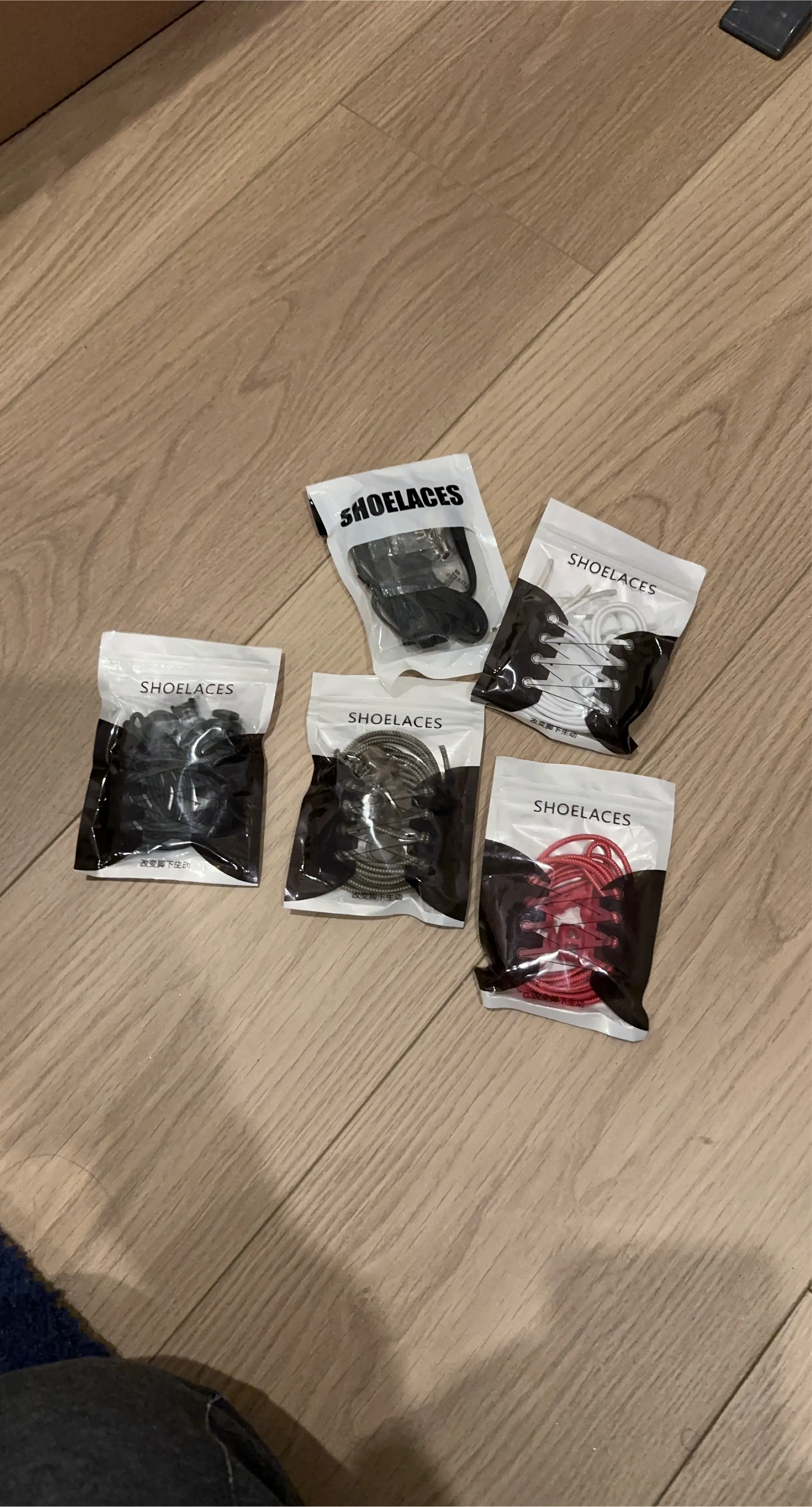 Selling a variety pack of shoelaces! You'll get an assortment of colours, including black, white, silver, and red. Perfect for adding a pop of colour to your footwear or replacing worn-out laces