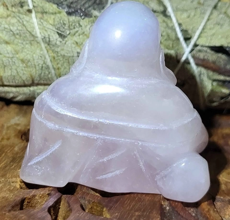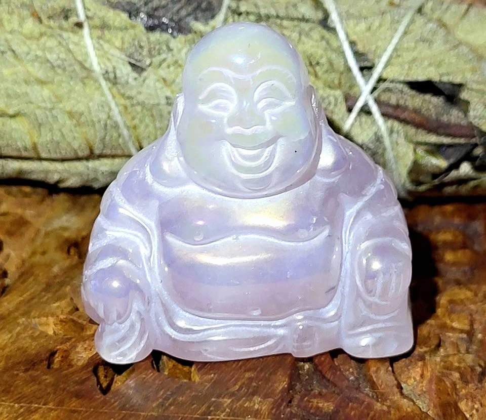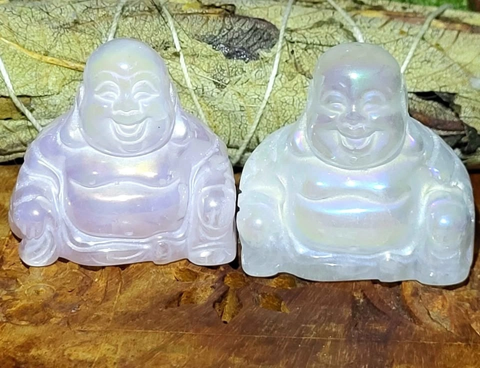 Aura coated Rose Quartz laughing Buddha. These are 2 inch tall.