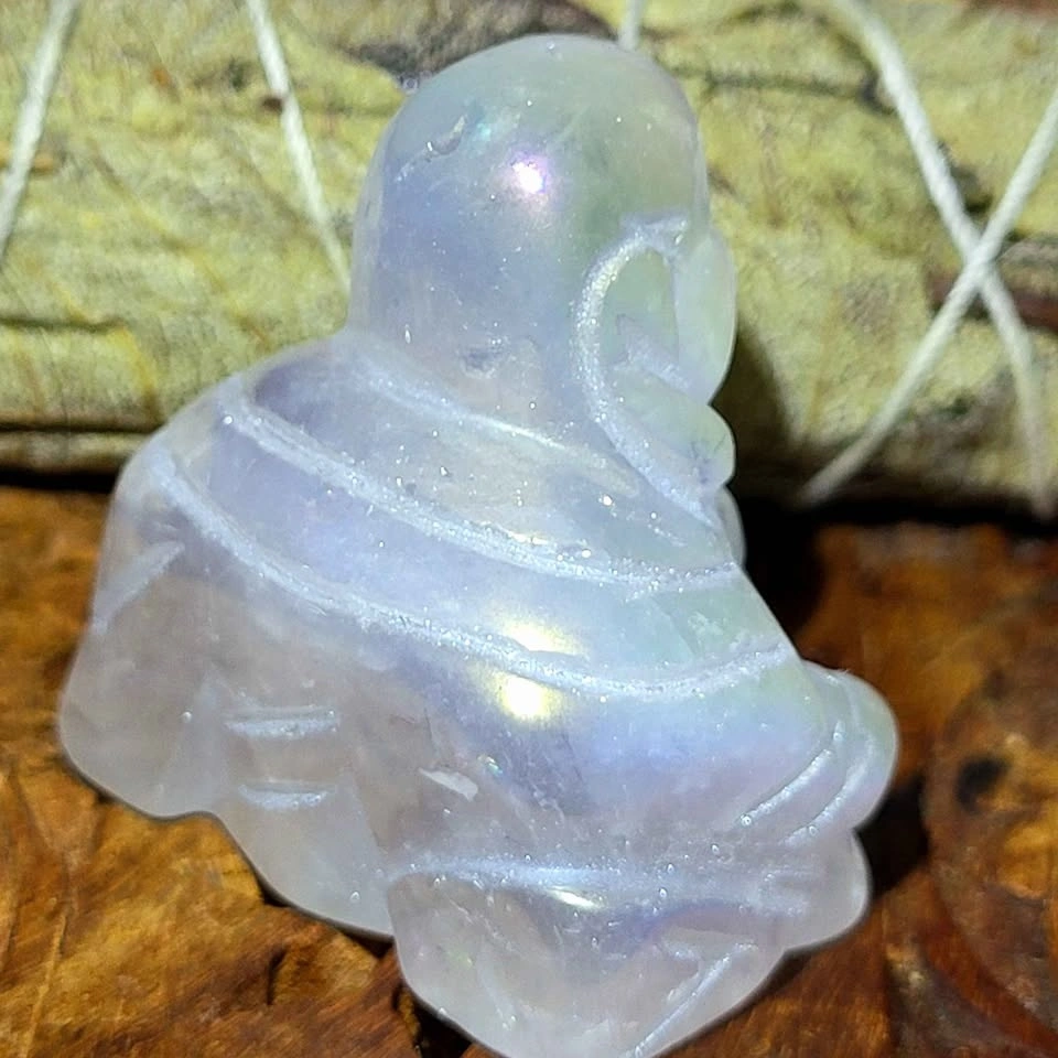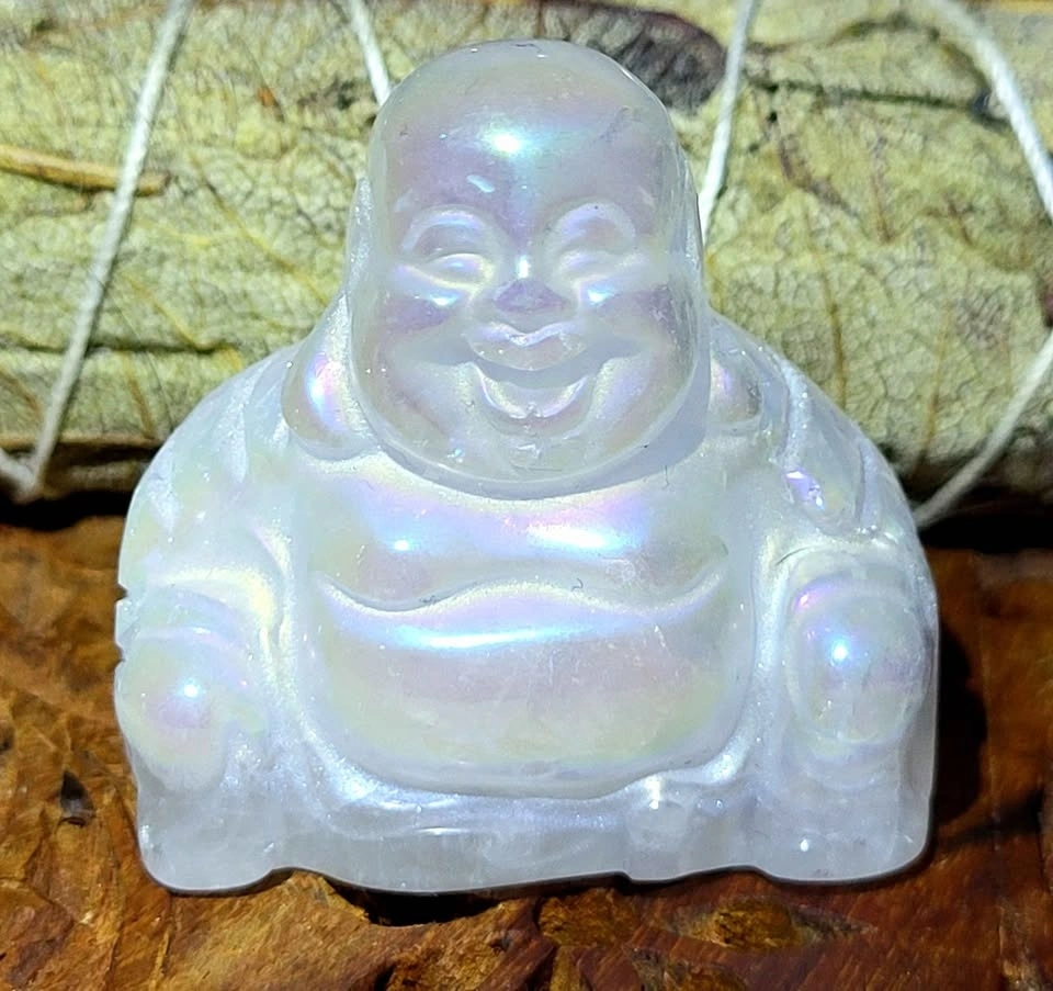 Aura coated Rose Quartz laughing Buddha. These are 2 inch tall.