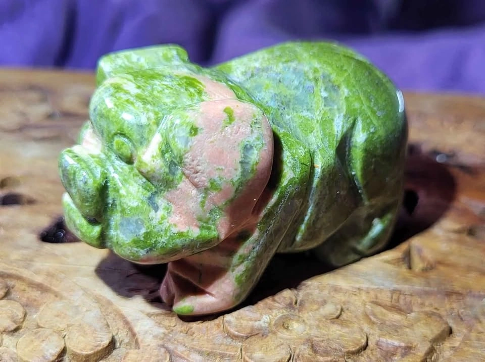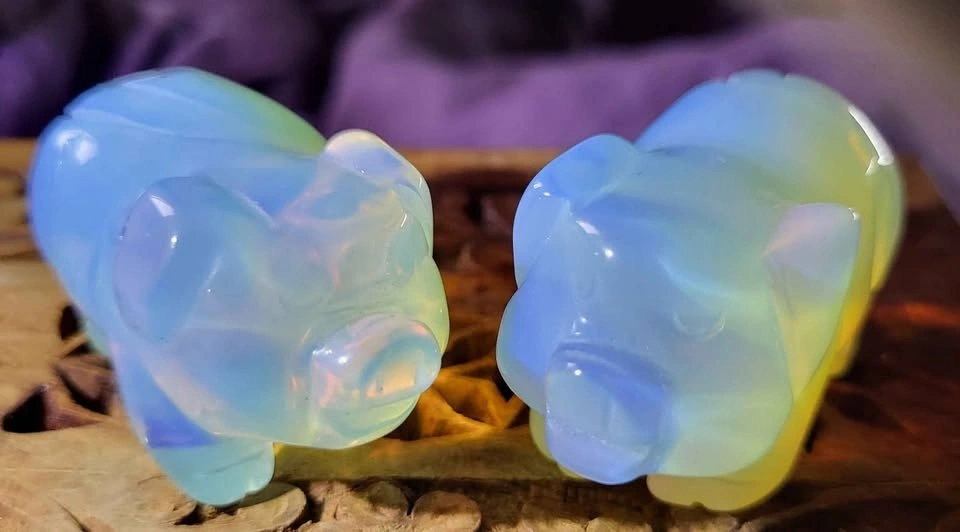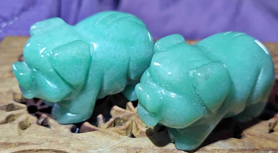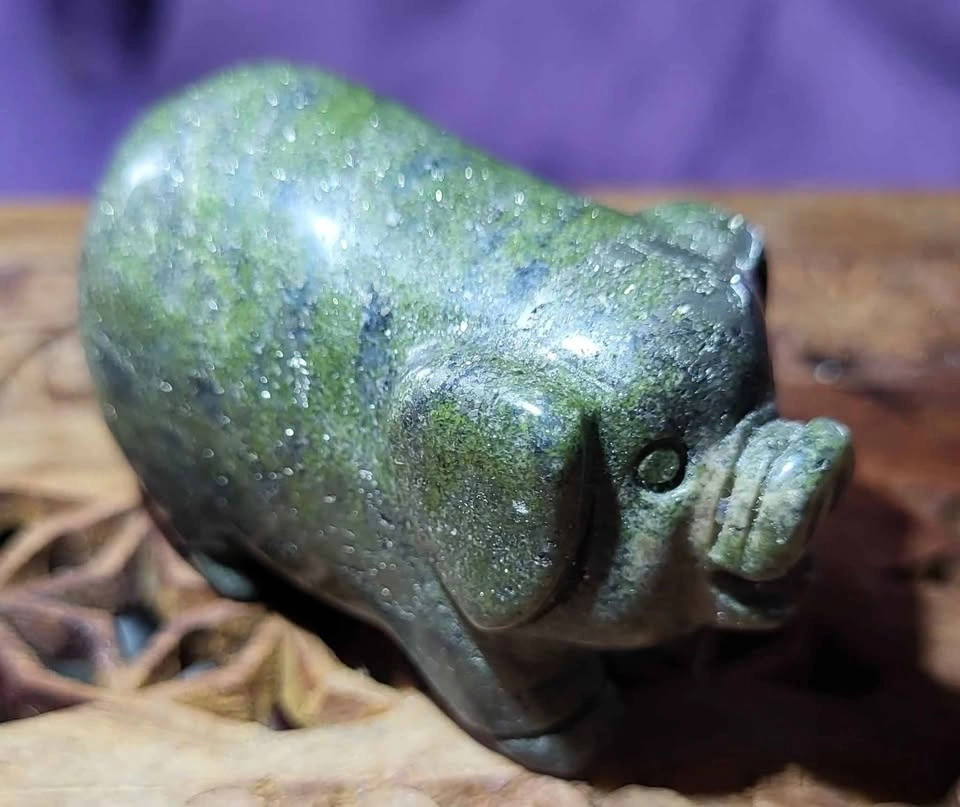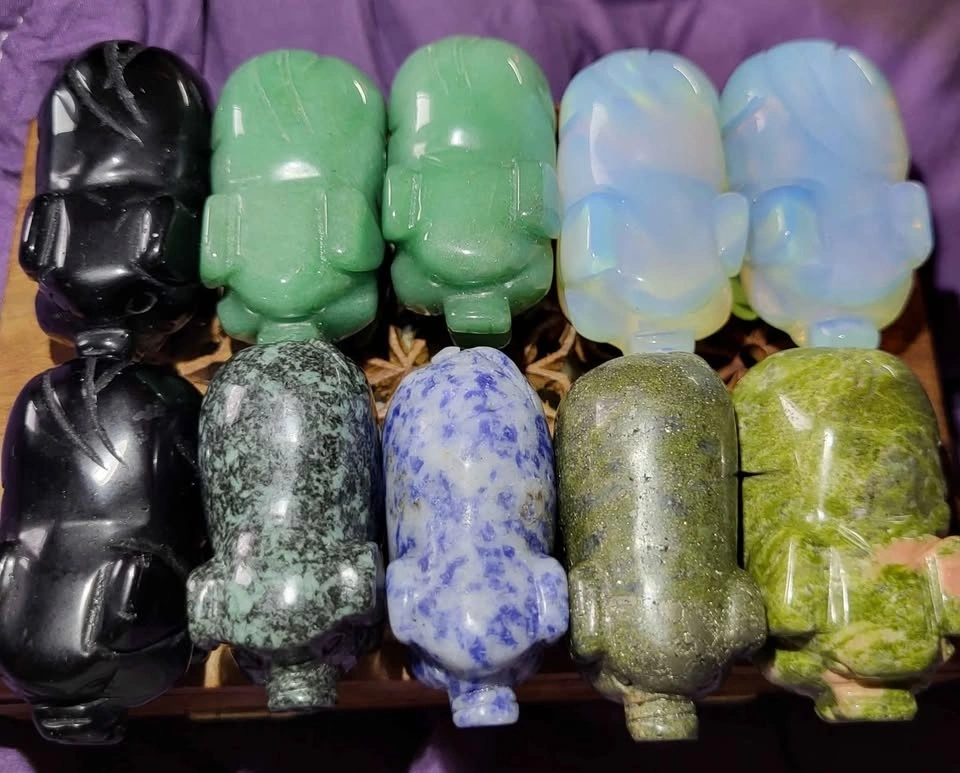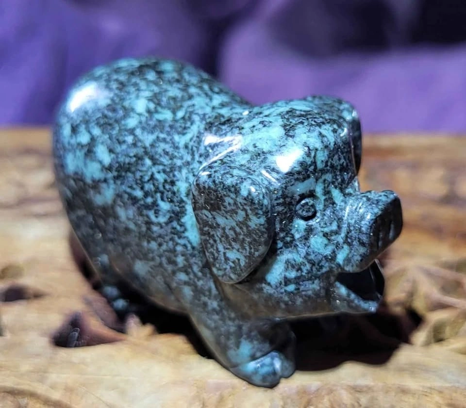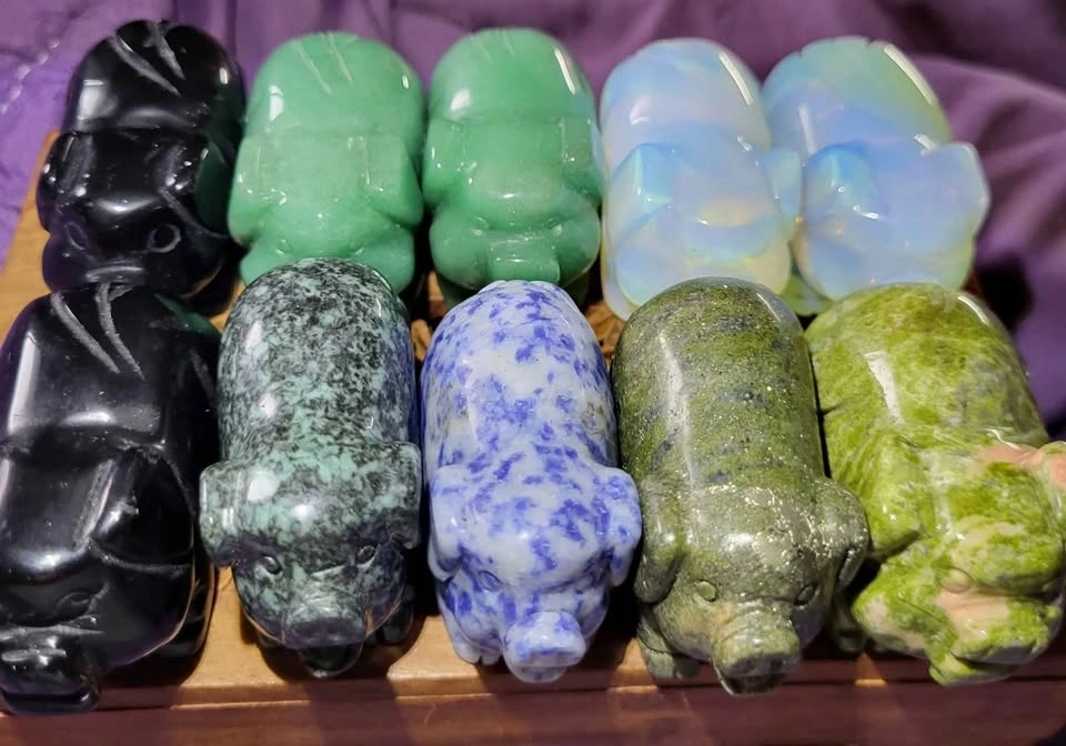 Crystal Pigs, sodalite, black Obsidian, Opalite, green Aventurine, Unakite, Pyrite, Jade, and Serpentine. These are all carved by hand. Each pig is $25 or I can sell the entire lot together. I also have other larger pig collectibles in different crystals.