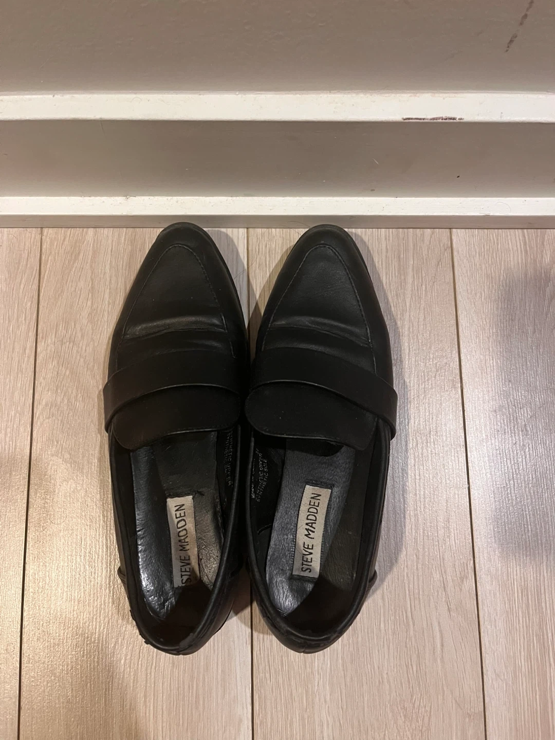 Selling a pair of Steve Madden black leather loafers. They're in great condition and ready for a new owner! Perfect for adding a touch of style to any outfit.