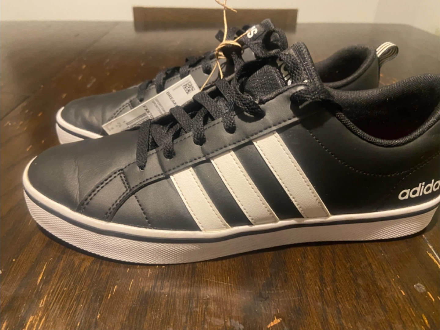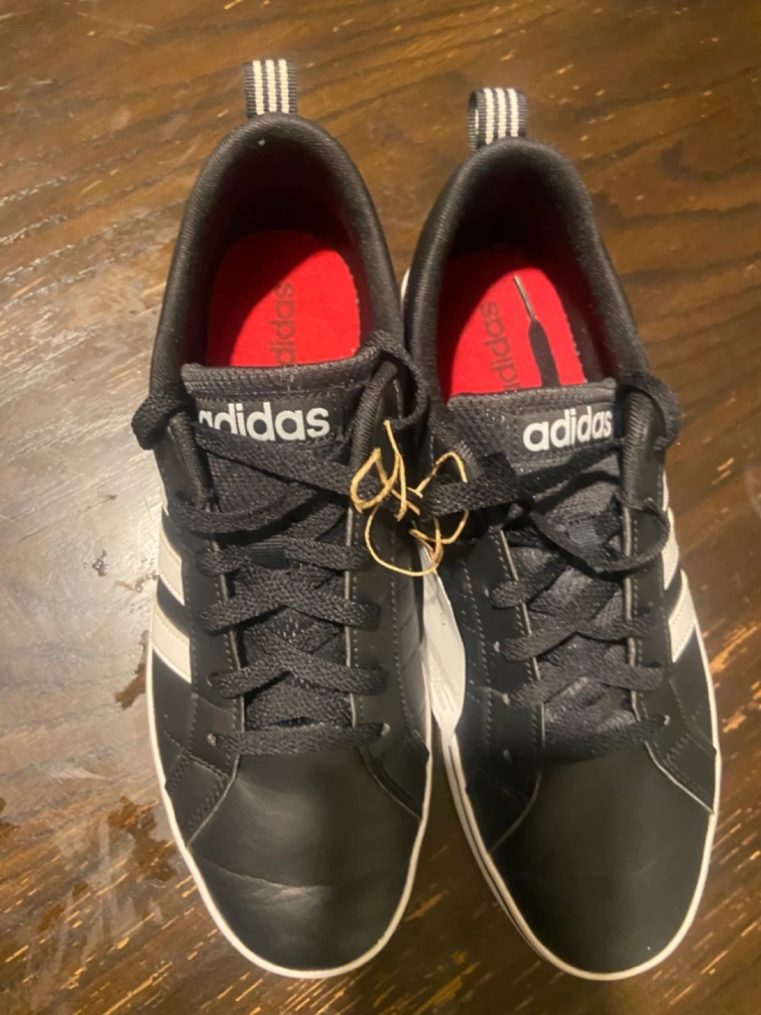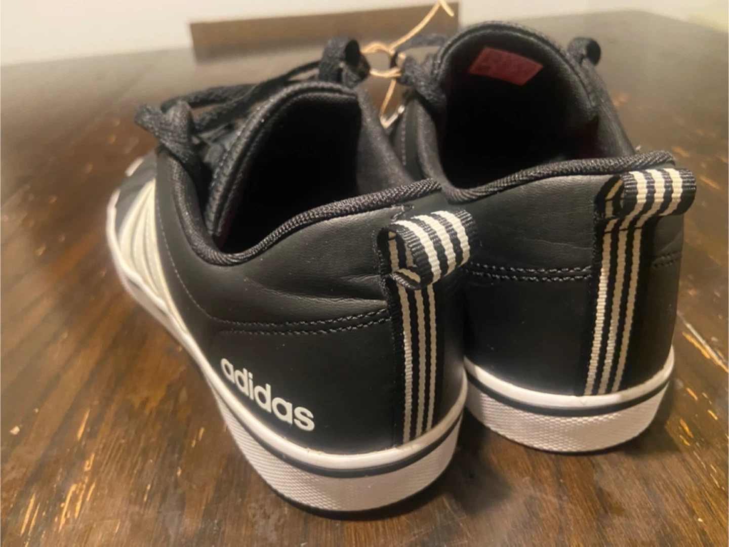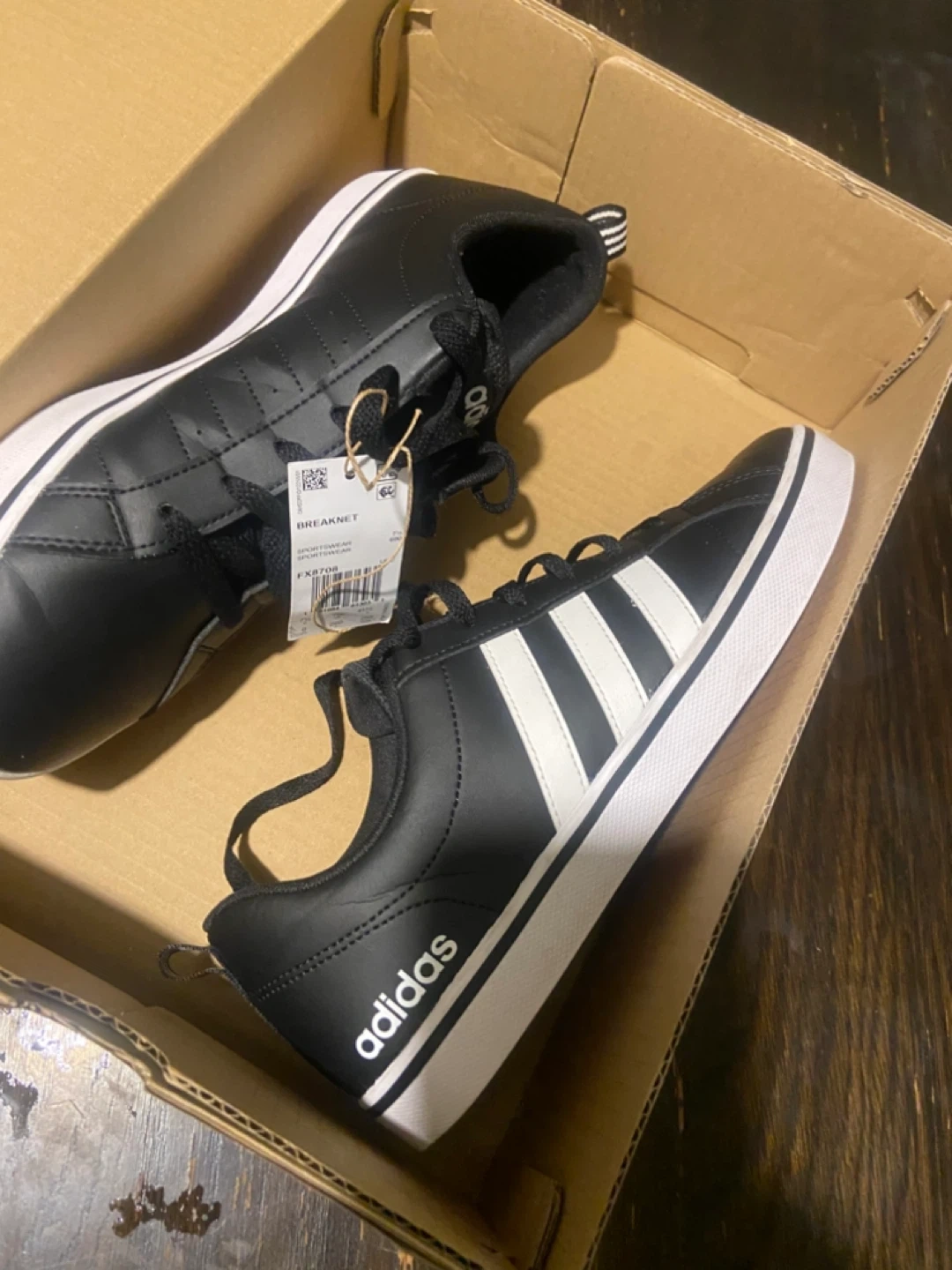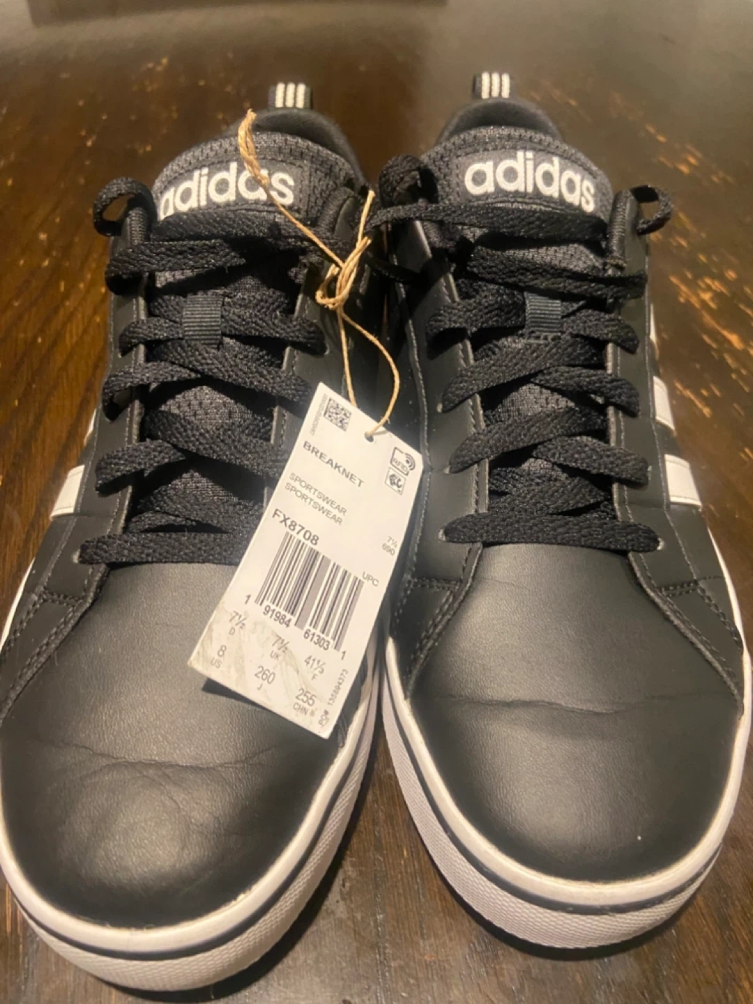 Adidas Breaknet shoes in black with white stripes! These are in great condition and come with the original box. The soles are red with the Adidas logo. A classic look for everyday wear! Compare to price in store good deal.
