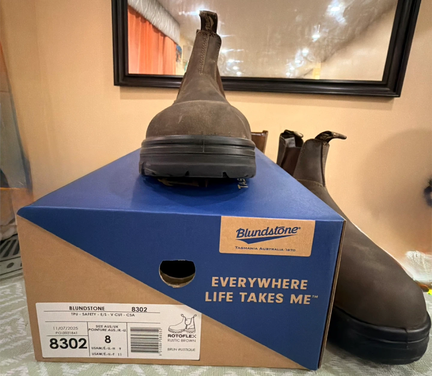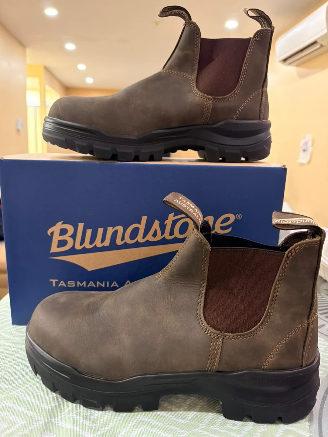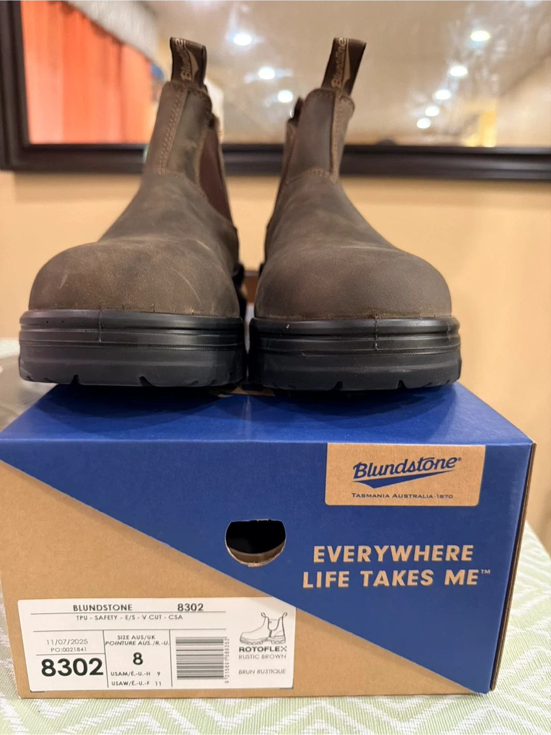Blundstone 8302 safety boots in rustic brown, size 8 UK/ 9 US men's. These boots are brand new and come with the original box. They're designed for safety and comfort, perfect for any job site!