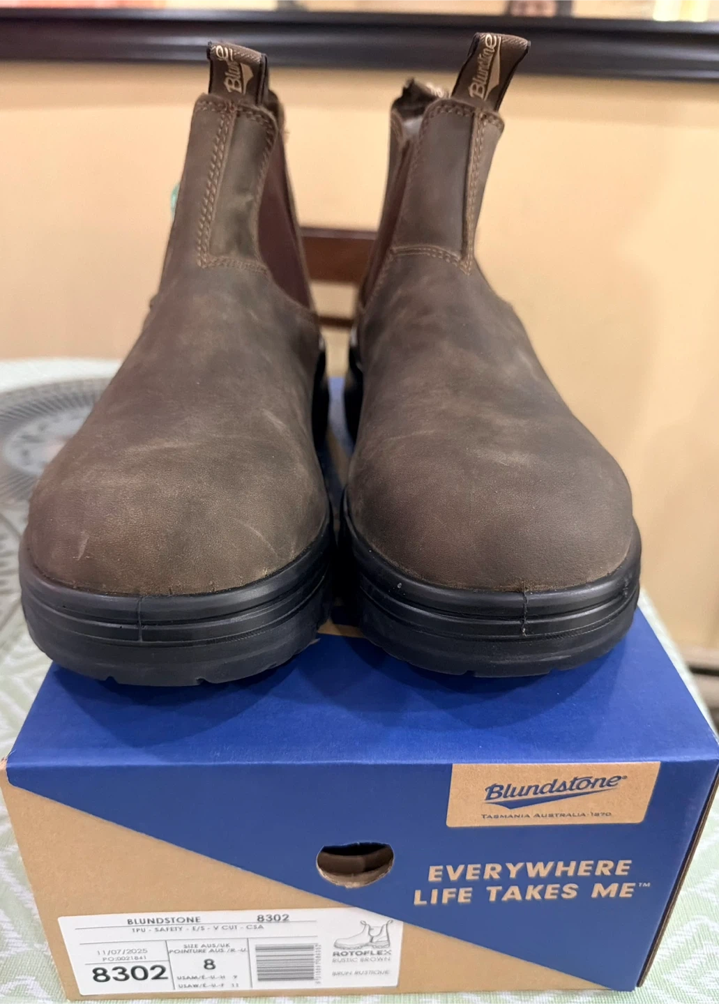 Blundstone 8302 safety boots in rustic brown, size 8 UK/ 9 US men's. These boots are brand new and come with the original box. They're designed for safety and comfort, perfect for any job site!