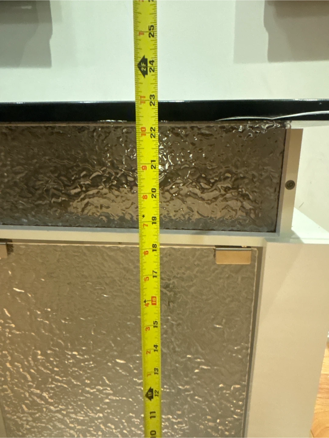 Console TV stand with a sleek black top and textured glass door panels. It has a shelf in the middle for your consoles or media players. The top measures about 63 inches in length. It's a great piece to add some style to your living room! Available for pickup and delivery.