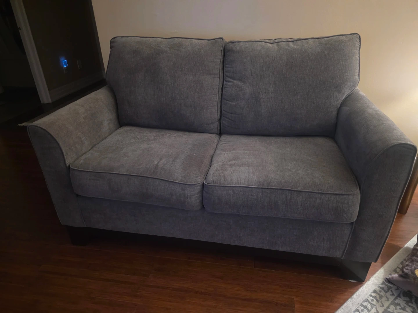 Selling a cozy loveseat sofa. It's a great size for smaller spaces and is in good condition. The grey colour is neutral and would fit well with any decor