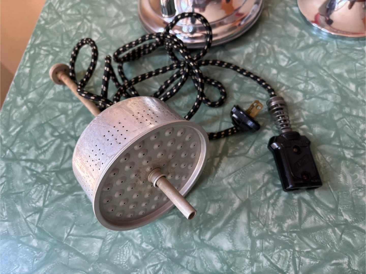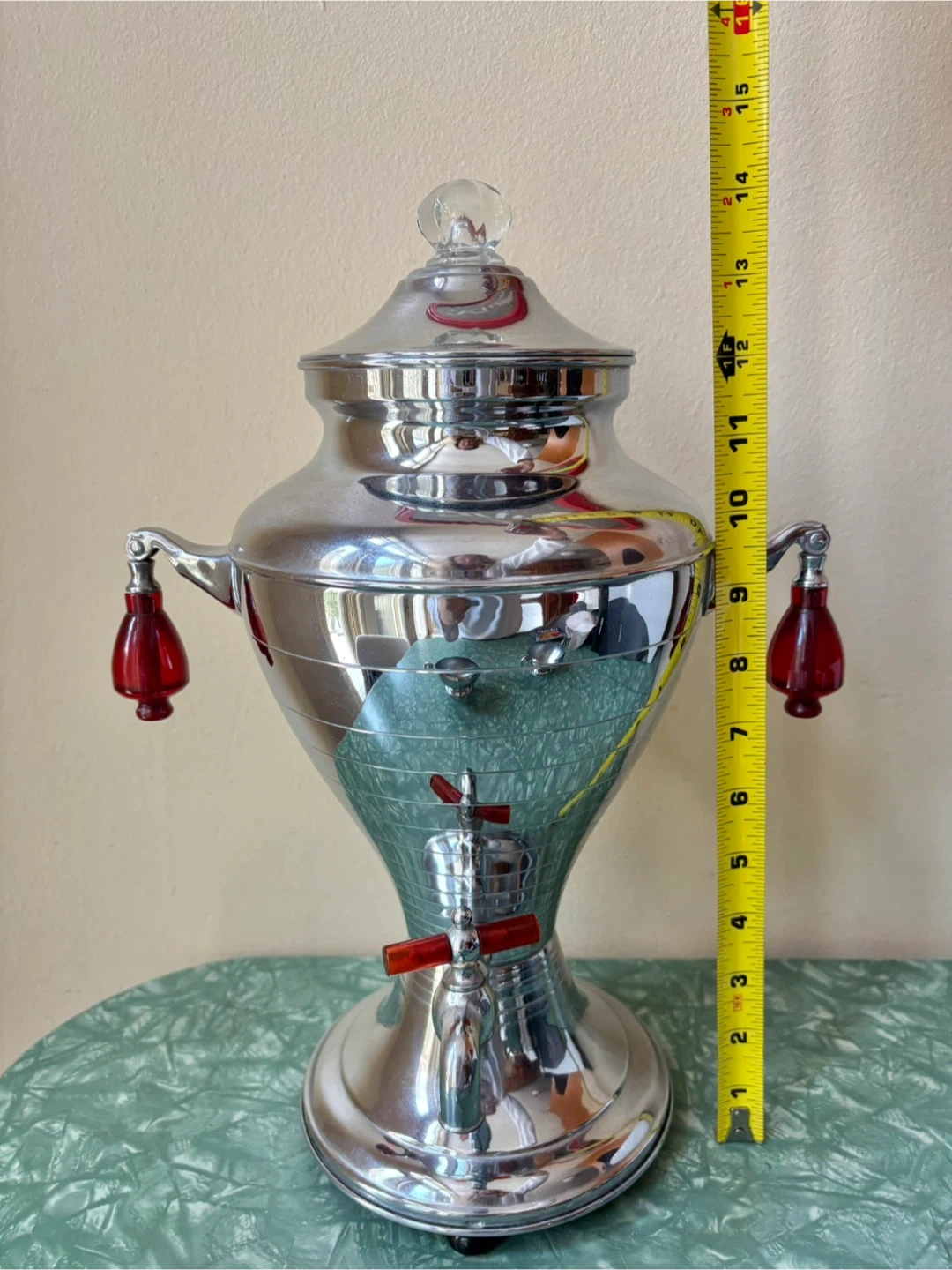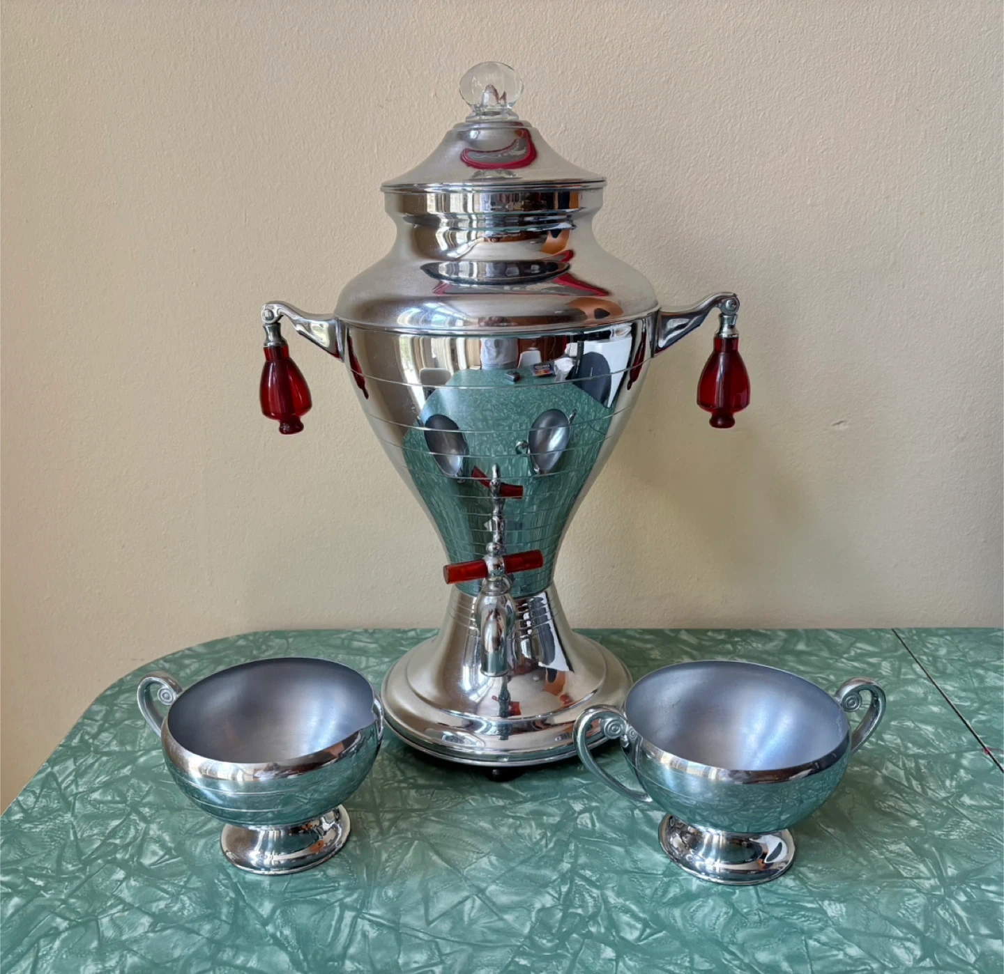 Selling a vintage chrome coffee percolator set, including the main dispenser, a sugar bowl, and a creamer. The dispenser stands approximately 15 inches tall. The sugar bowl and creamer are about 4 inches in diameter. This set would be a great addition to any vintage kitchen collection! Bakelite handles!