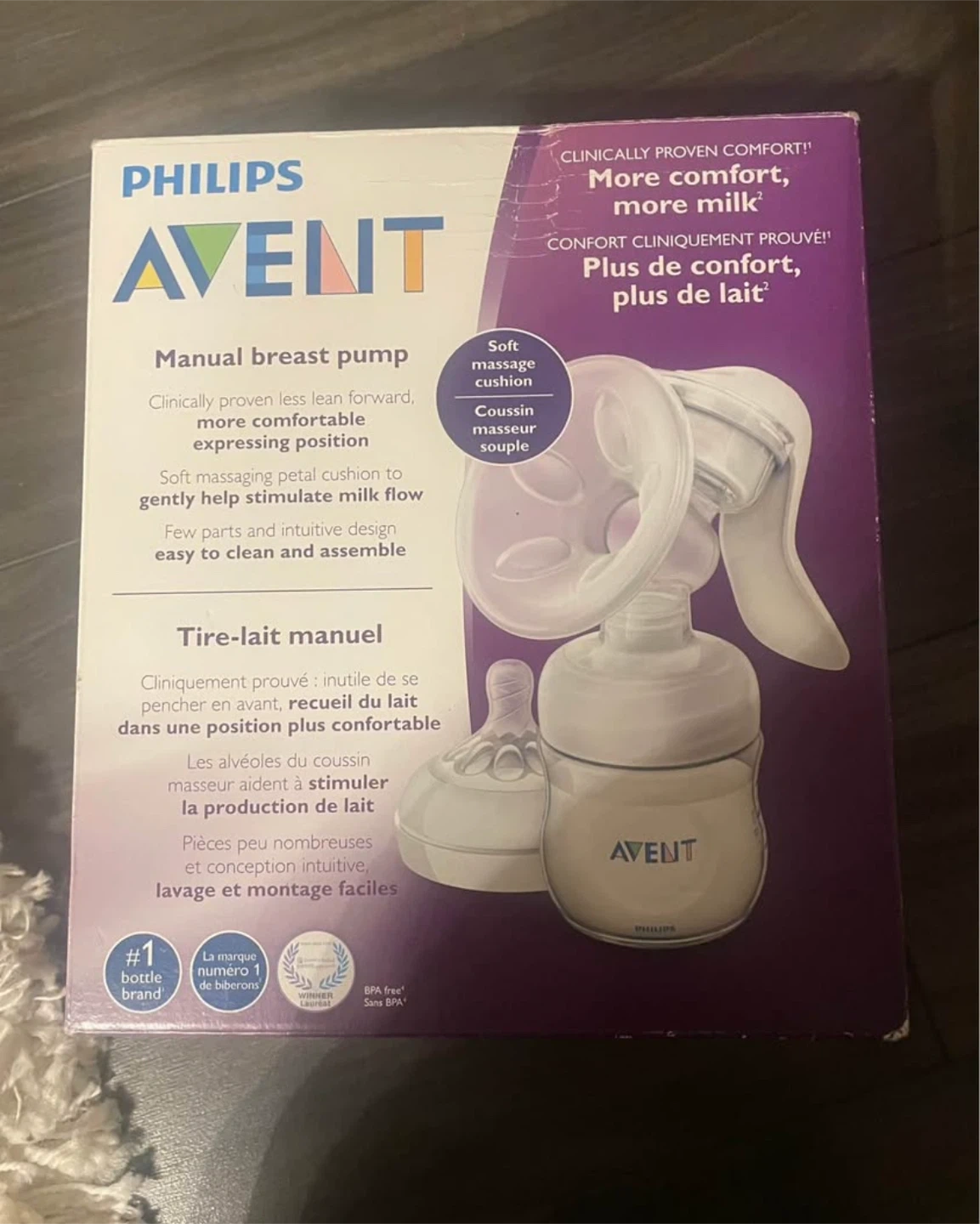 Selling a Philips Avent manual breast pump! It's designed to be clinically proven for comfort and helps you express milk more comfortably. The soft massage cushion is gentle, and it's easy to clean and assemble. Comes with the box