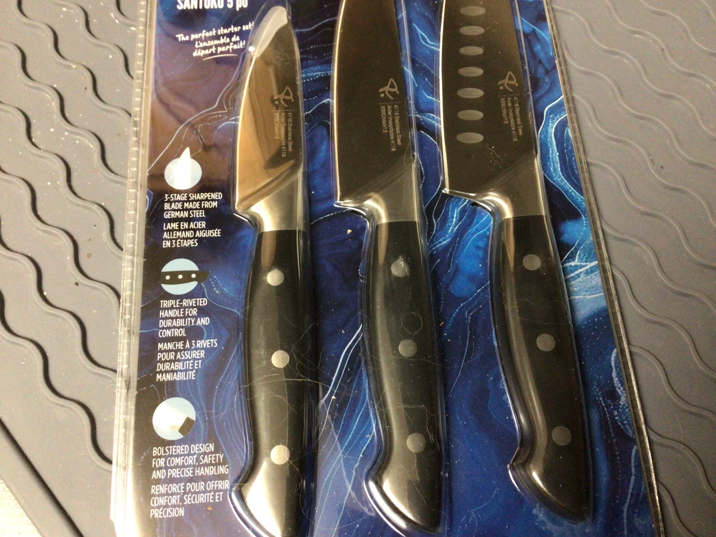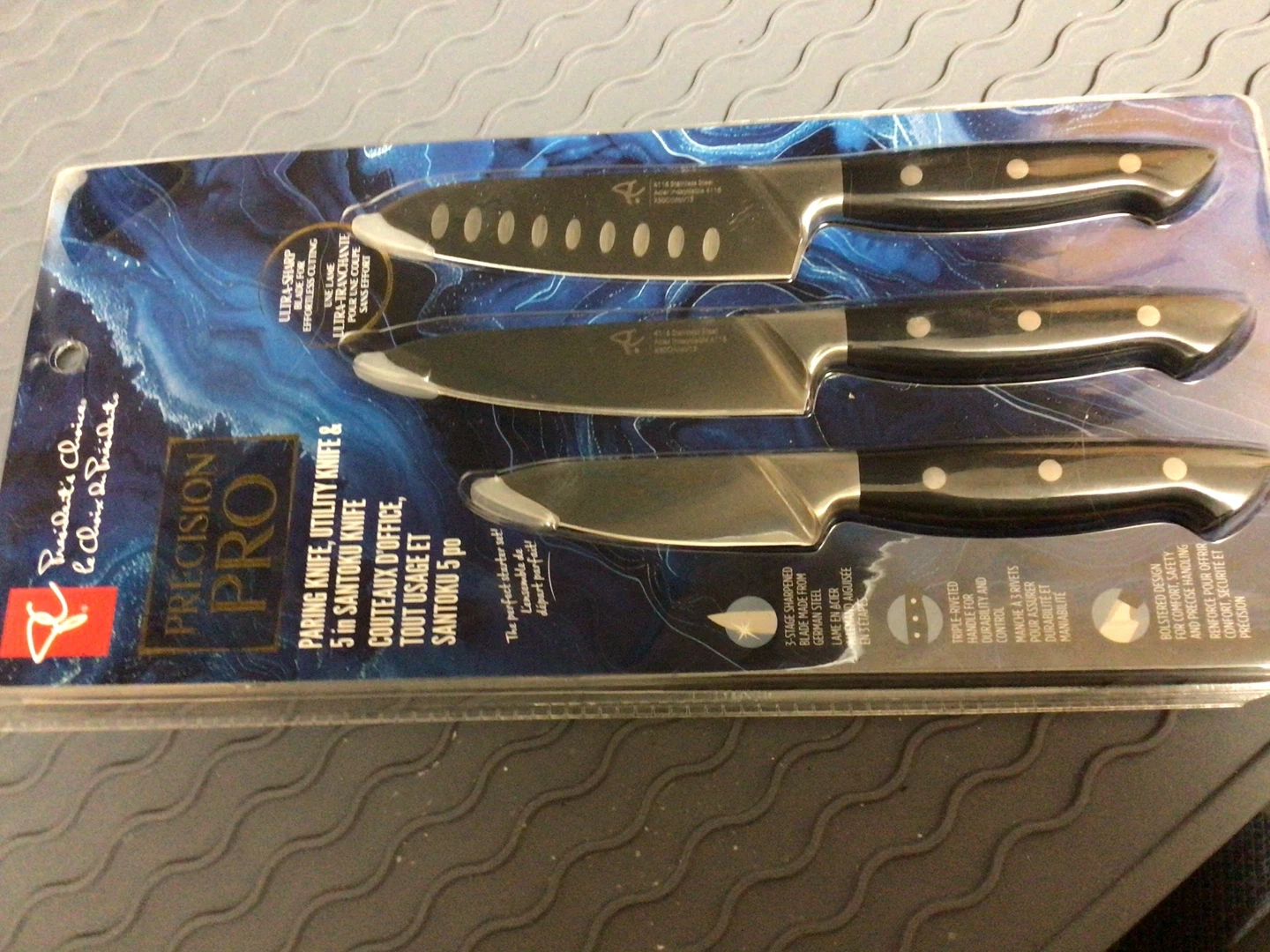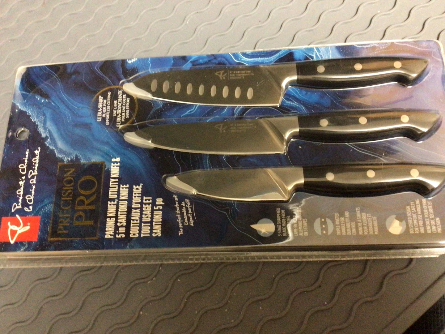 Selling a Precision Pro knife set, still in its original packaging! This set includes a paring knife, a utility knife, and a 5-in santoku knife. It's the perfect starter set for anyone looking to upgrade their kitchen knives. The blades are ultra-sharp for effortless cutting. The knives feature a triple-riveted handle for durability and control, and a bolstered design for comfort, safety, and precise handling