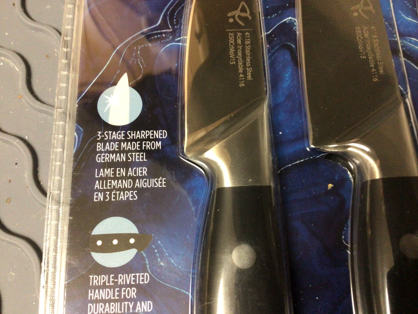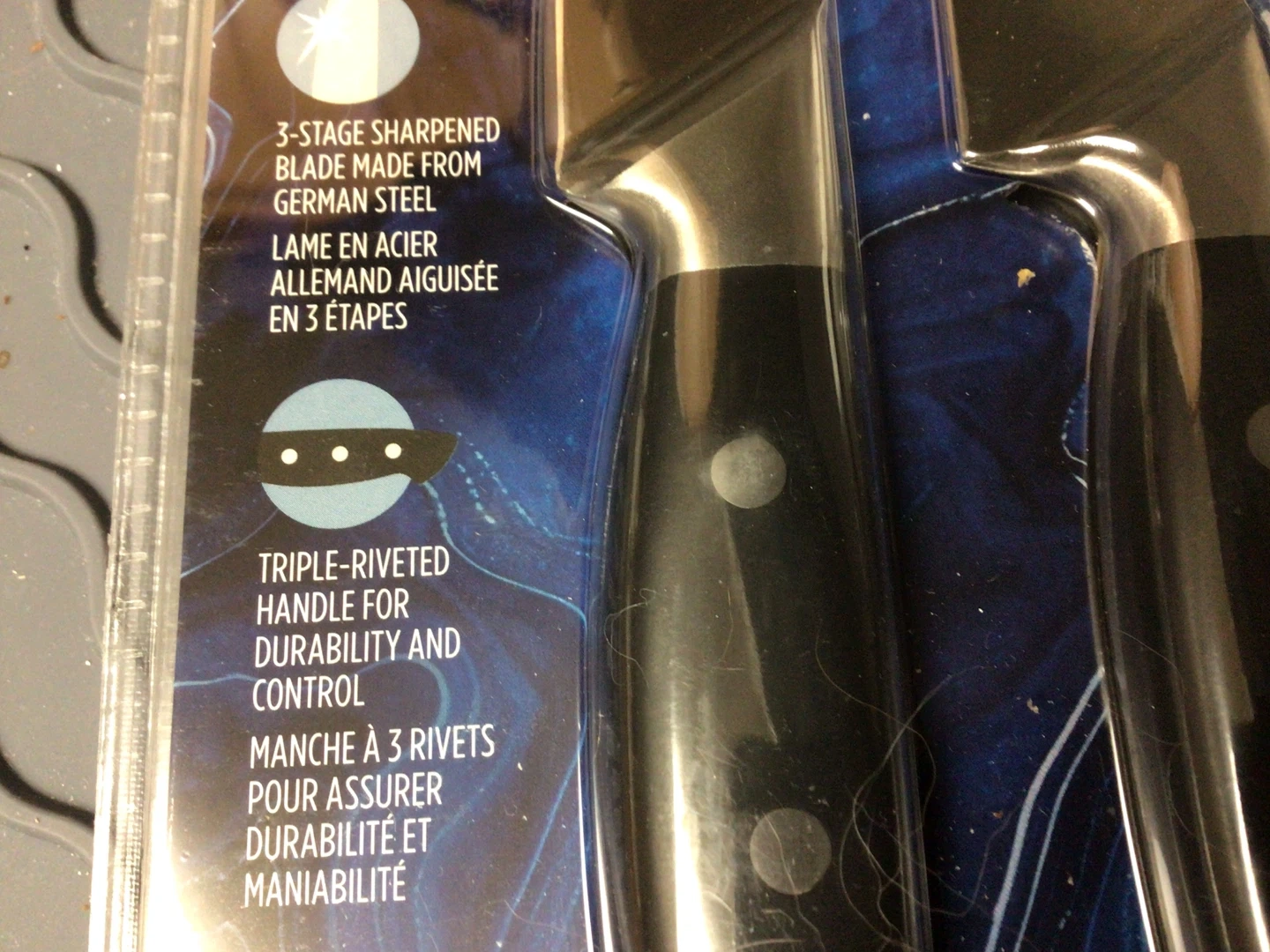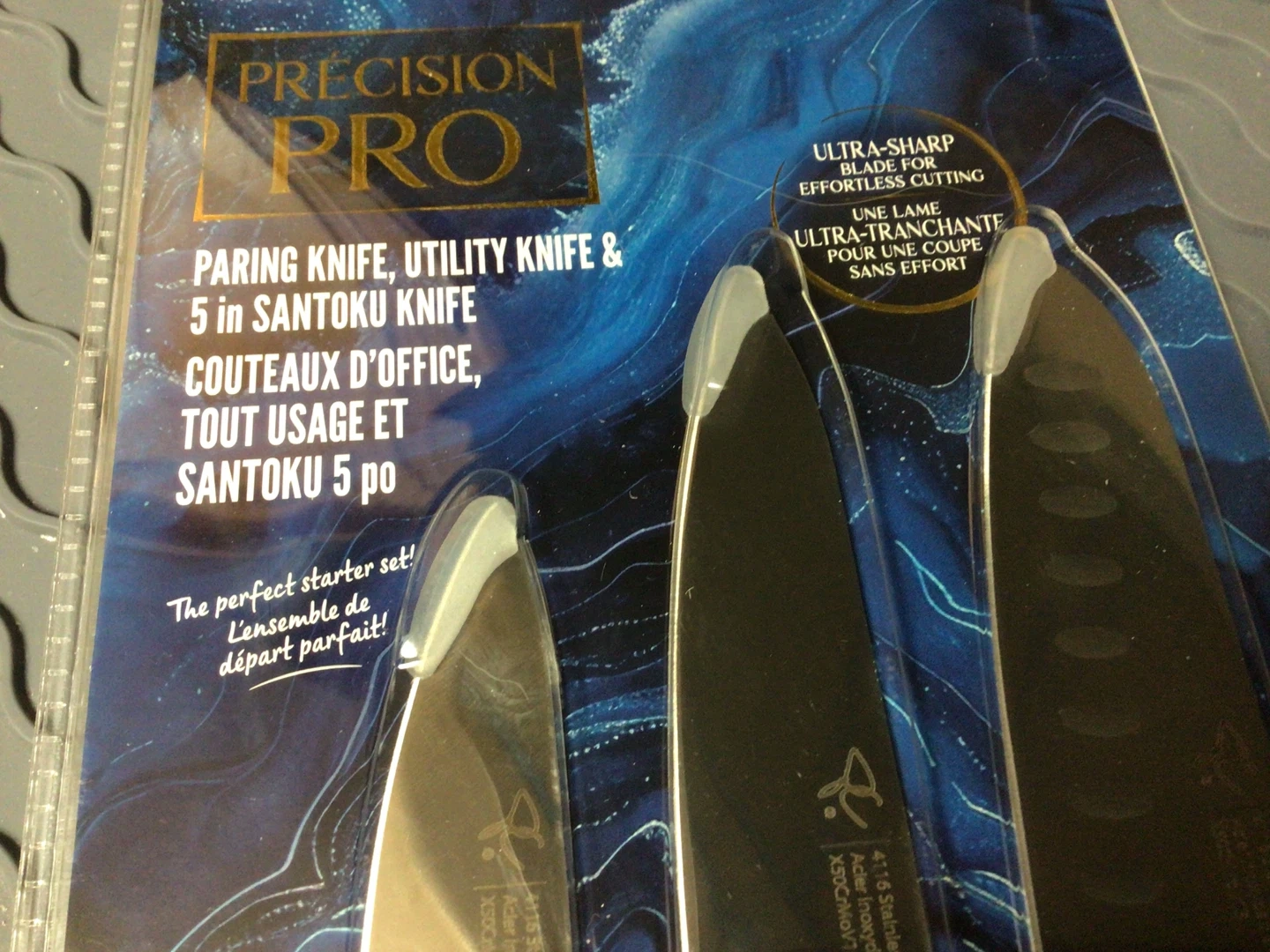 Selling a Precision Pro knife set, still in its original packaging! This set includes a paring knife, a utility knife, and a 5-in santoku knife. It's the perfect starter set for anyone looking to upgrade their kitchen knives. The blades are ultra-sharp for effortless cutting. The knives feature a triple-riveted handle for durability and control, and a bolstered design for comfort, safety, and precise handling
