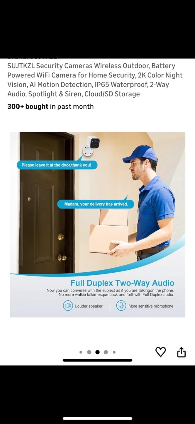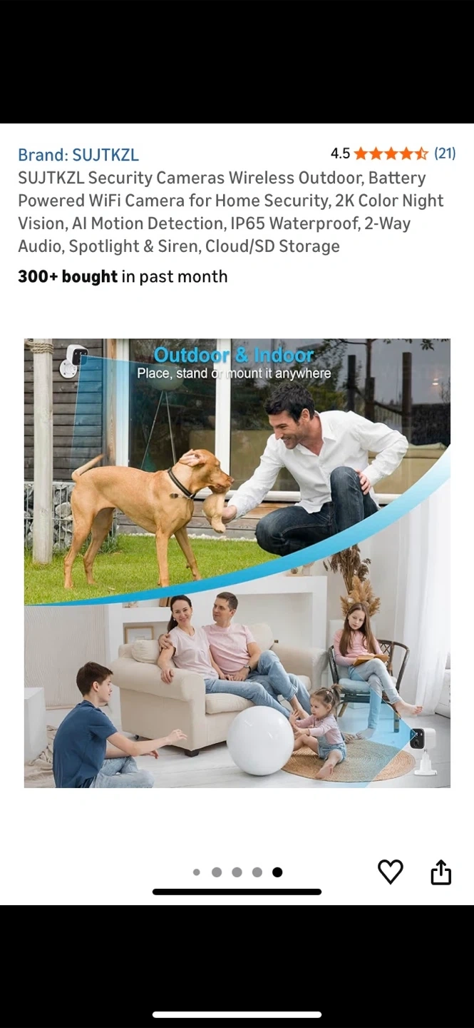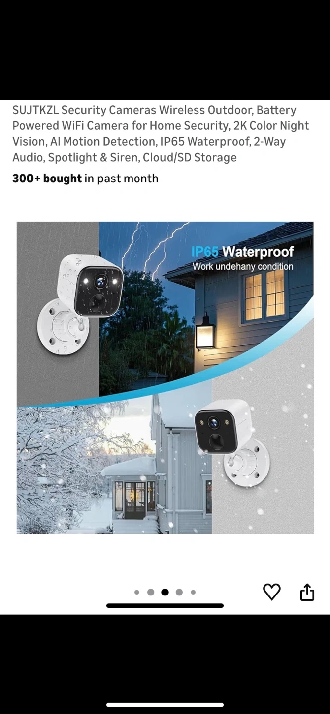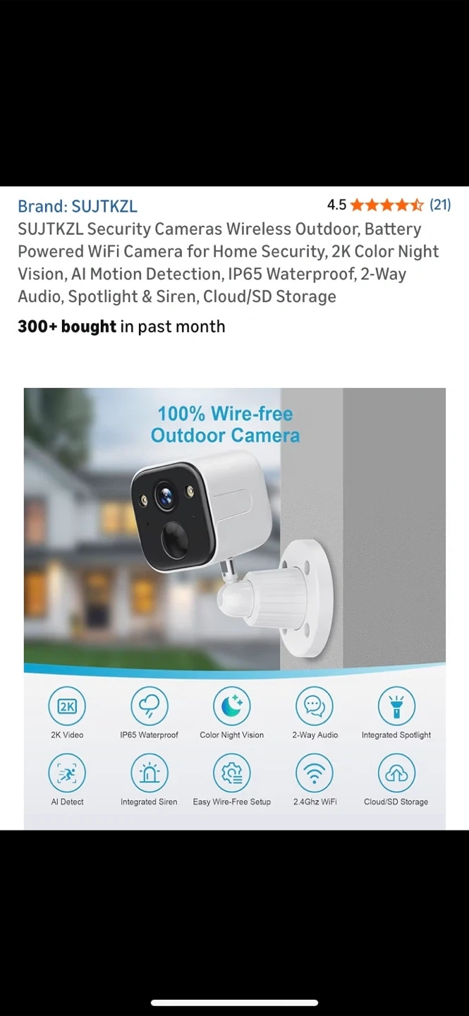 Selling a SUJTKZL wireless outdoor security camera. It features 2K color night vision, AI motion detection, and is IP65 waterproof. It also has 2-way audio, spotlight and siren, and cloud/SD storage.