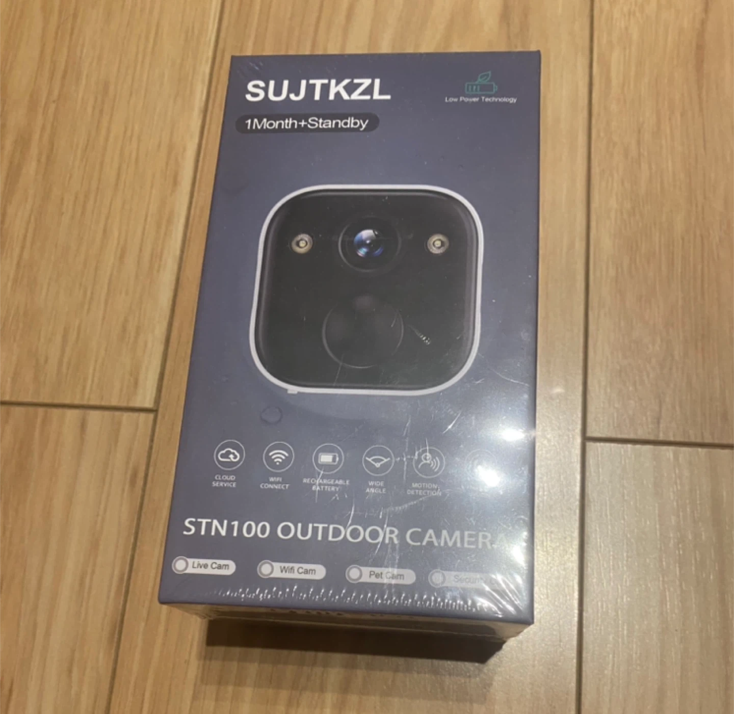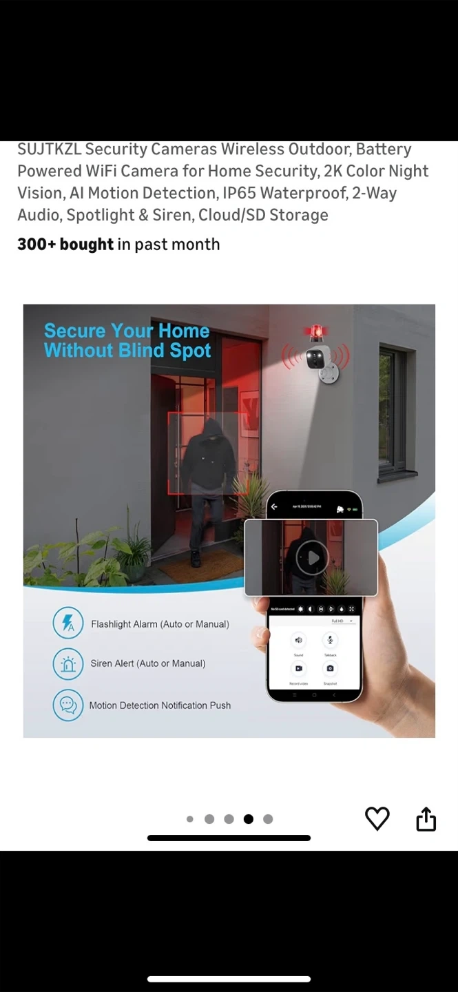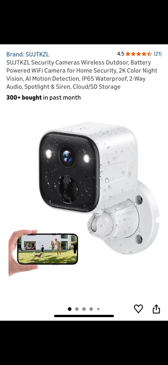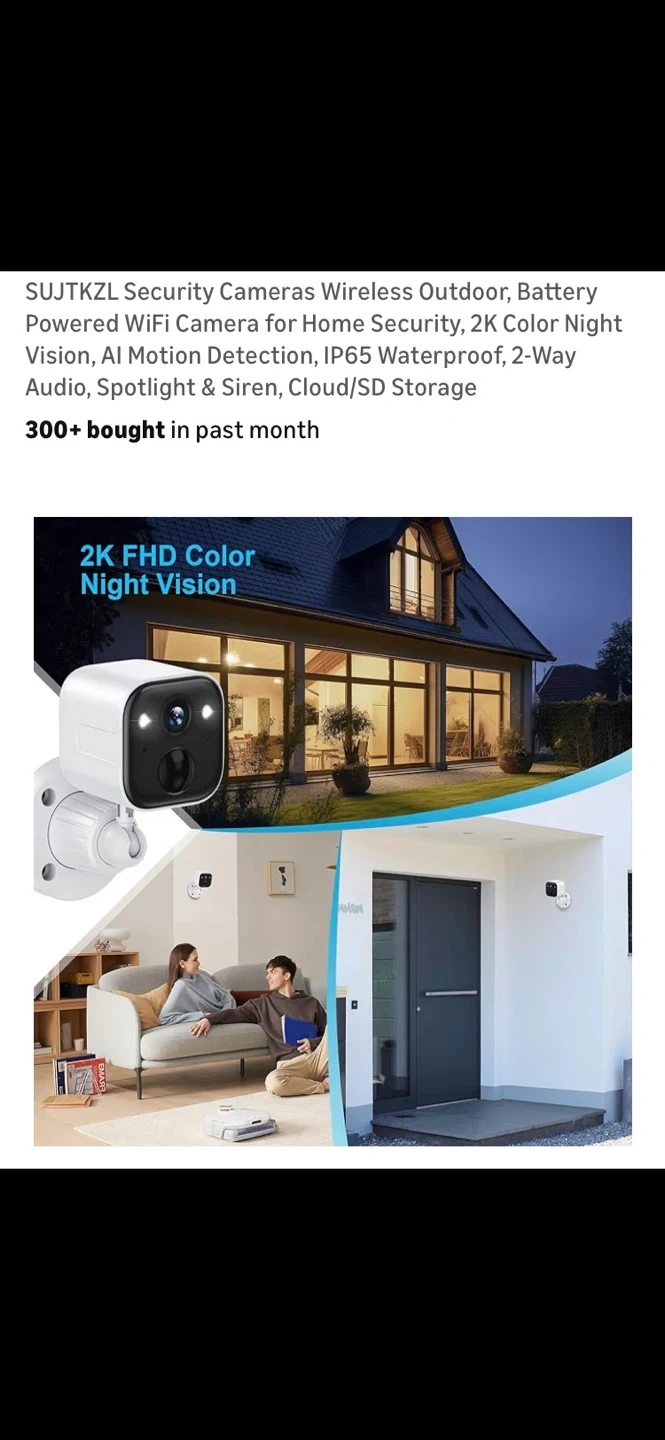 Selling a SUJTKZL wireless outdoor security camera. It features 2K color night vision, AI motion detection, and is IP65 waterproof. It also has 2-way audio, spotlight and siren, and cloud/SD storage.