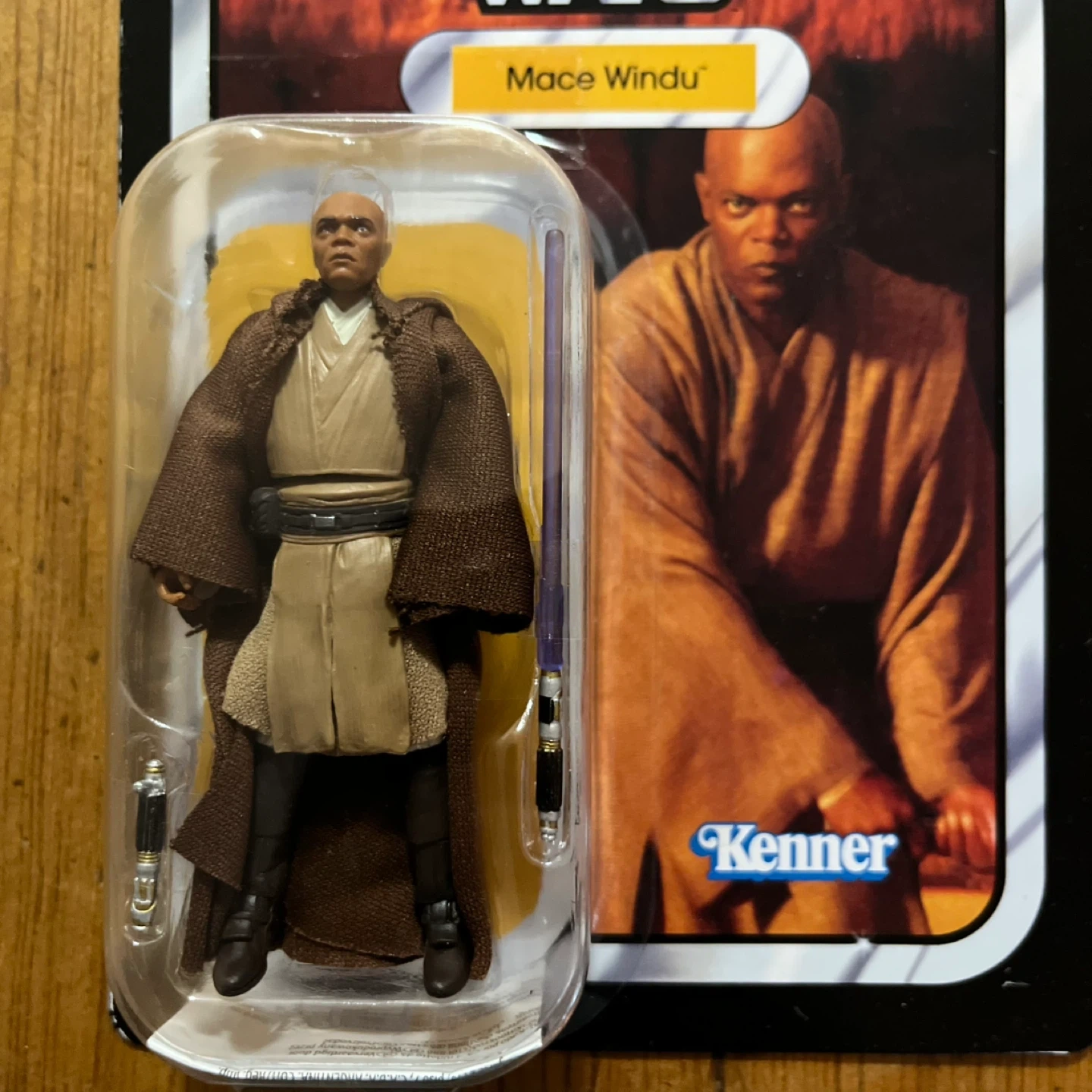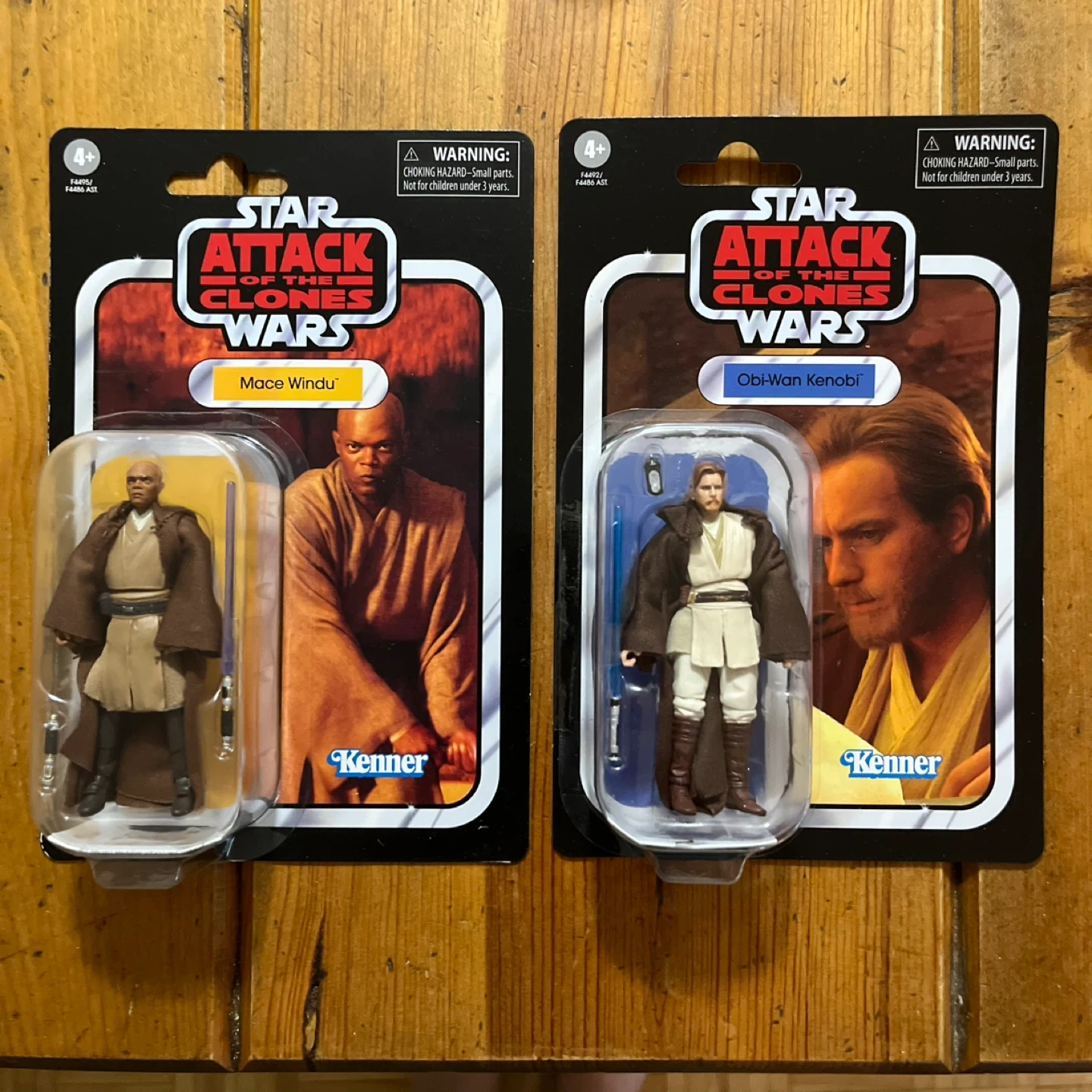Selling Star Wars: Attack of the Clones 3.75-inch scale action figures, featuring Mace Windu and Obi-Wan Kenobi (find it on Amazon: https://amzn.to/3Za5z2S).