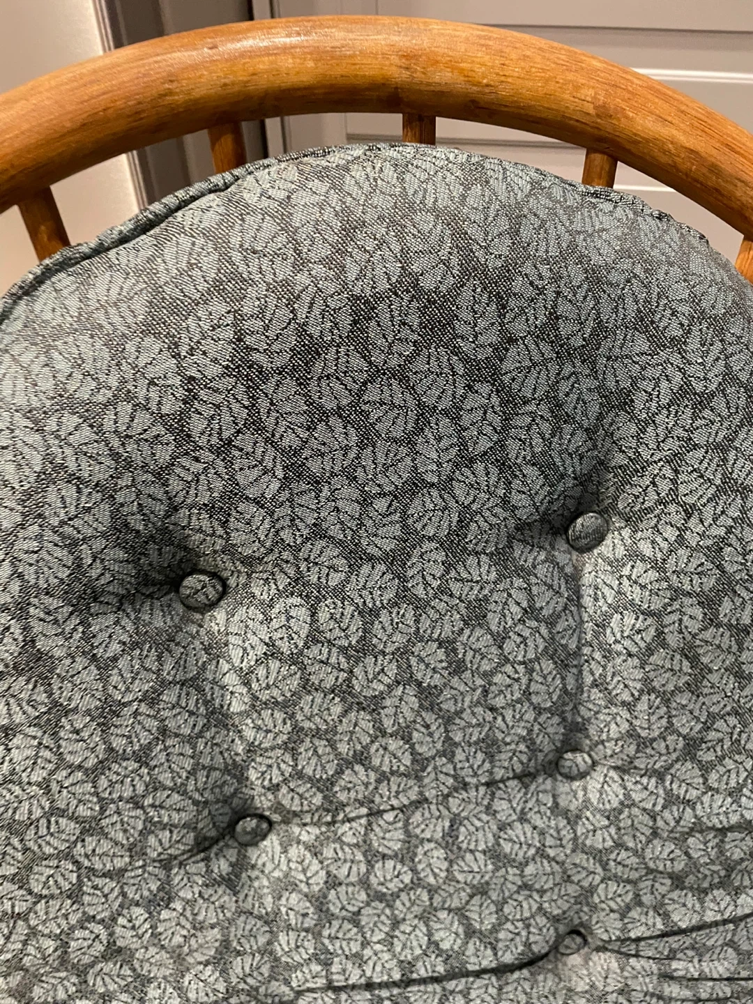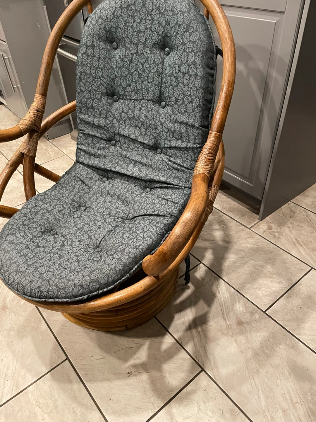 Comfortable rattan swivel chair with a patterned cushion. It's in great shape and ready for a new space in your home!