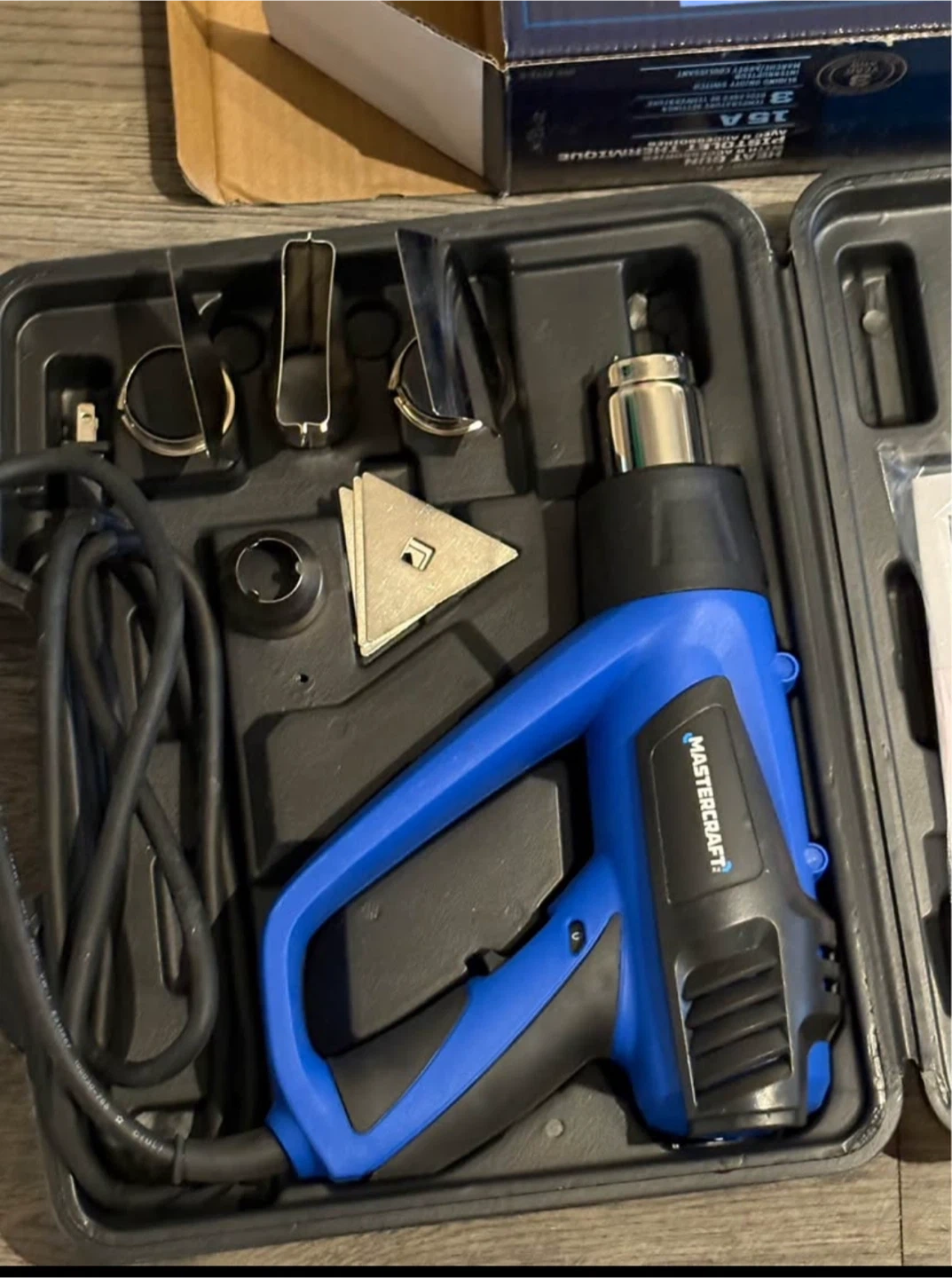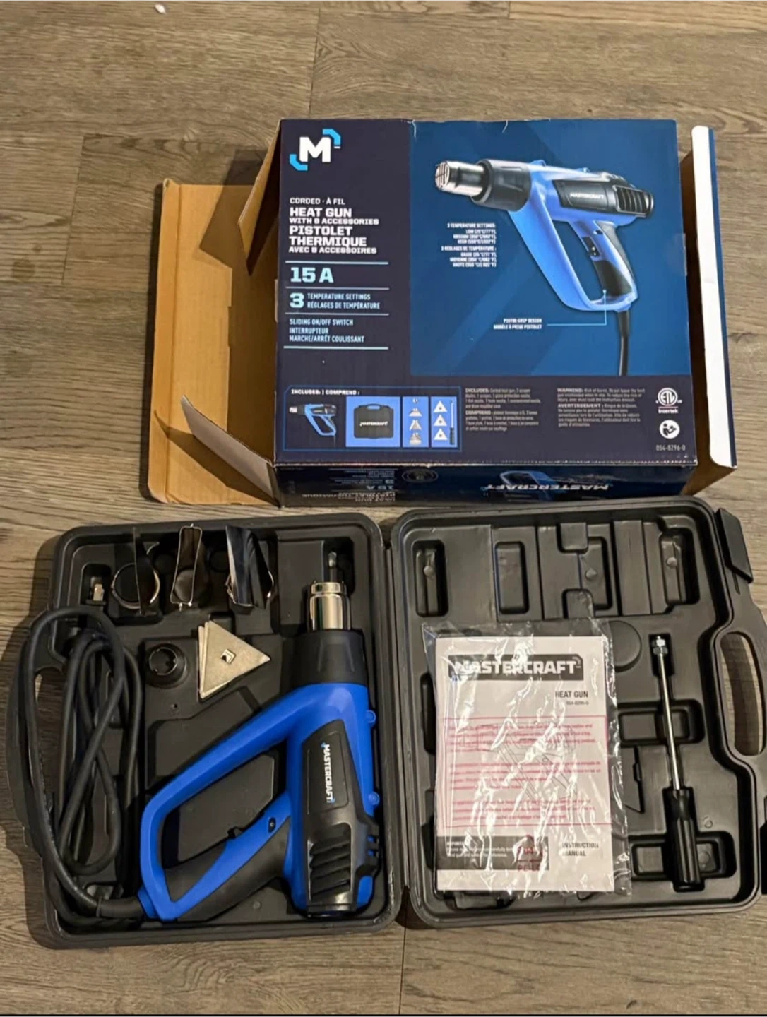 Looking to sell a Mastercraft heat gun! This is a corded heat gun with accessories and comes with the box. It has 3 temperature settings and an on/off switch