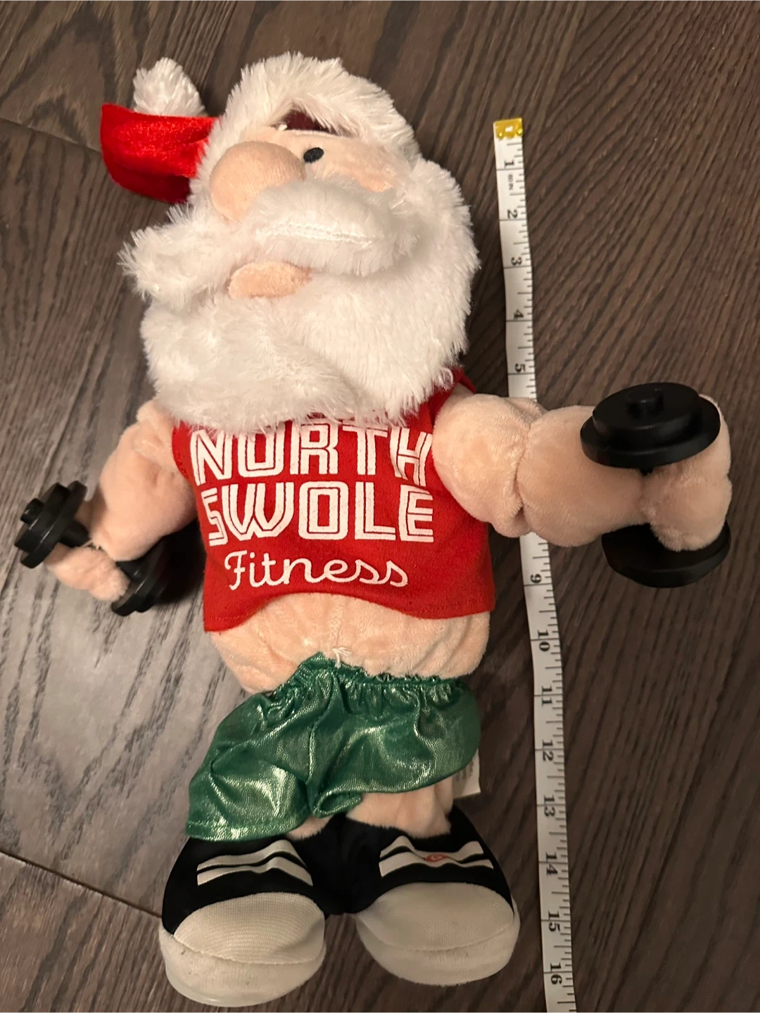 This Santa plush is ready to pump some iron! He's wearing a 'North Swole Fitness' tank top and comes with his own set of dumbbells. He measures approximately 16 inches tall.