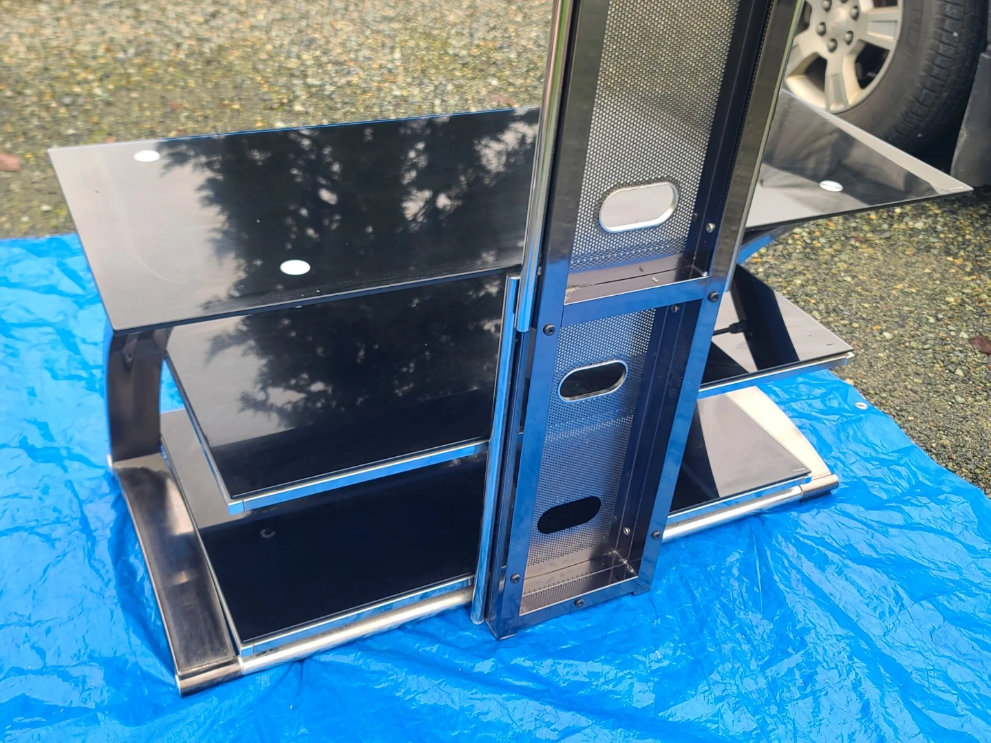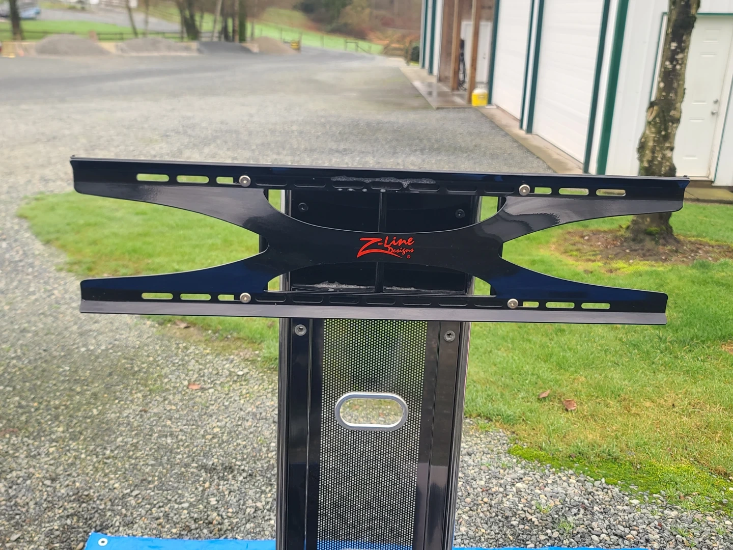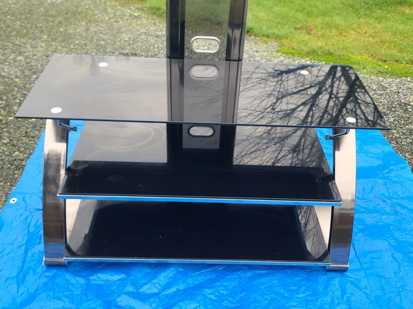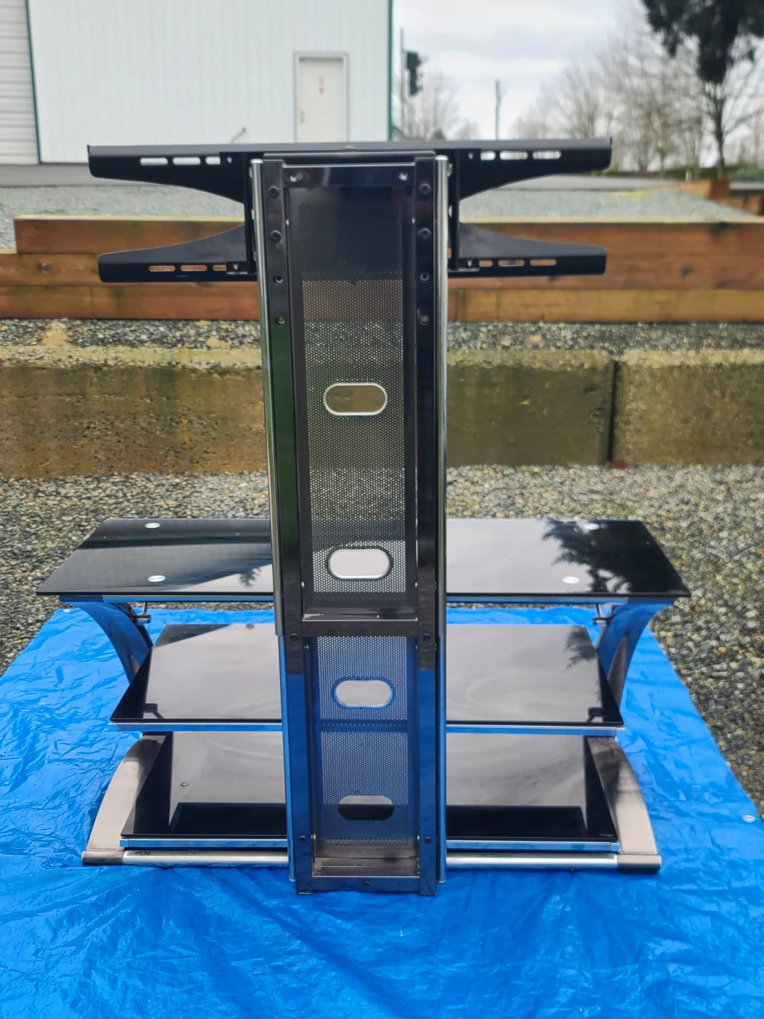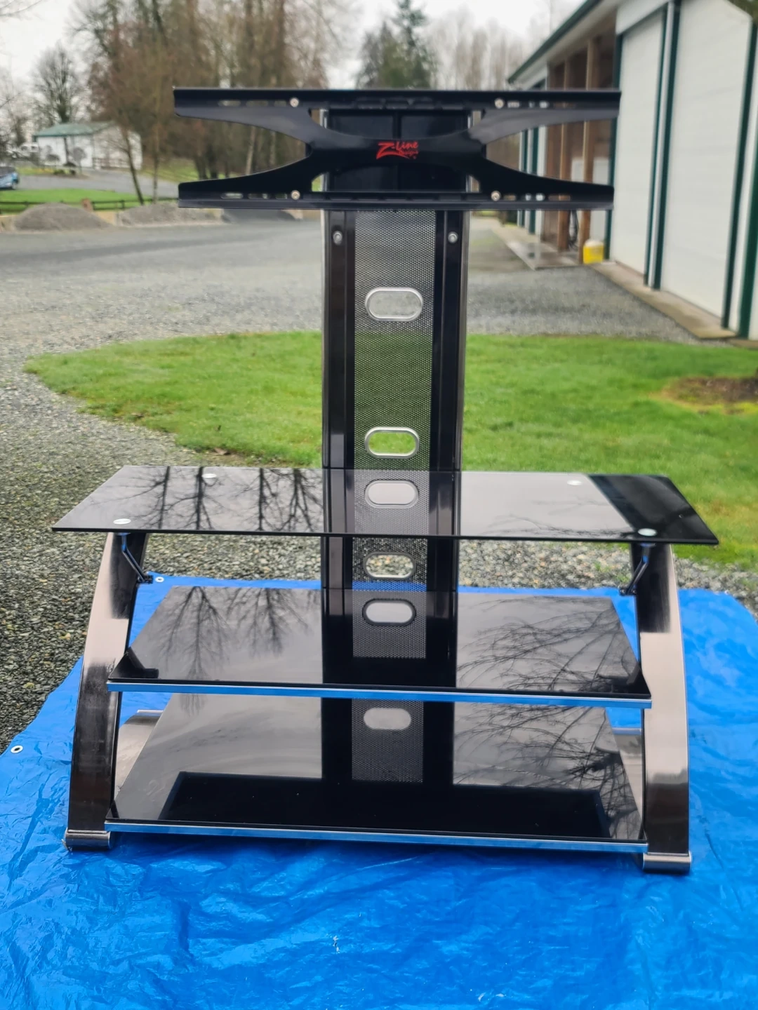 Z-Line Designs TV stand! It features a sleek black design with multiple shelves. Perfect for organizing your entertainment system and adding a modern touch to your living room