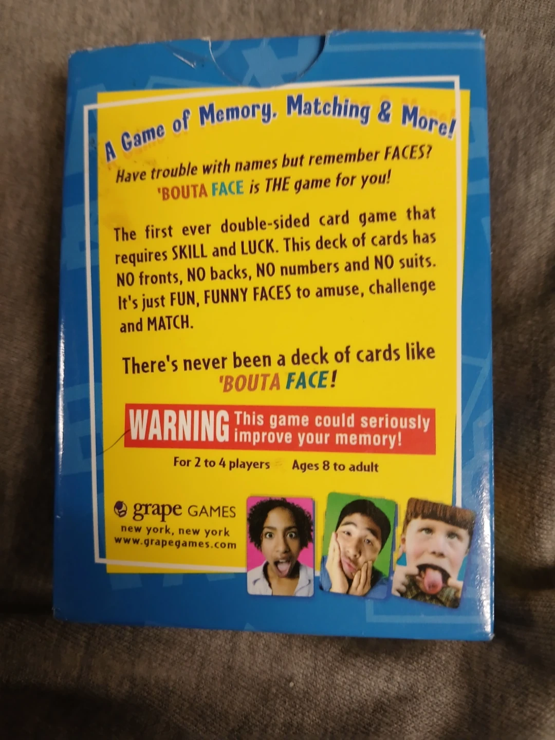 Selling a Bouta Face card game! It's a fantastic first-ever double-sided card game, perfect for memory, matching, and more! Great for 2 to 4 players, ages 8 to adult. This game could seriously improve your memory