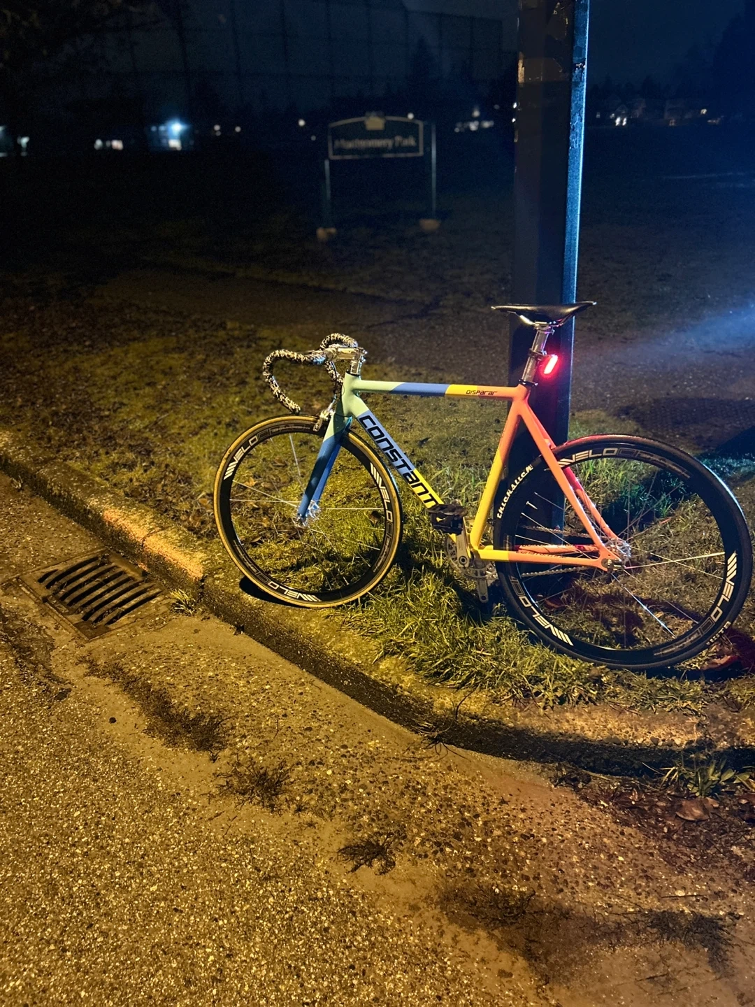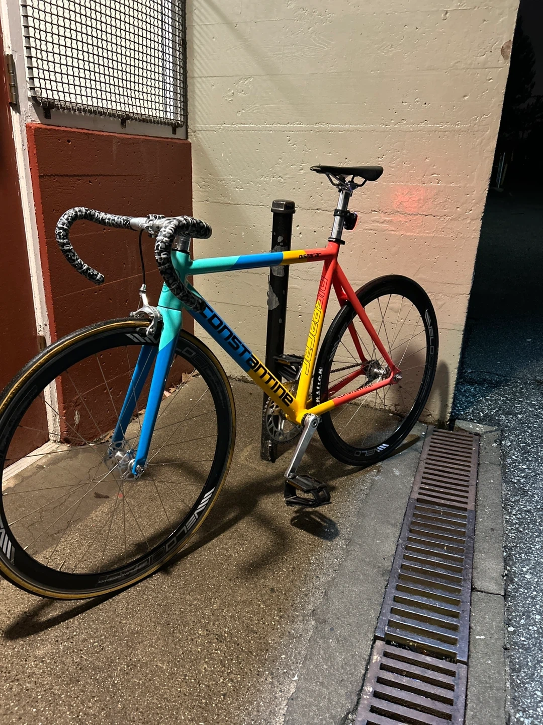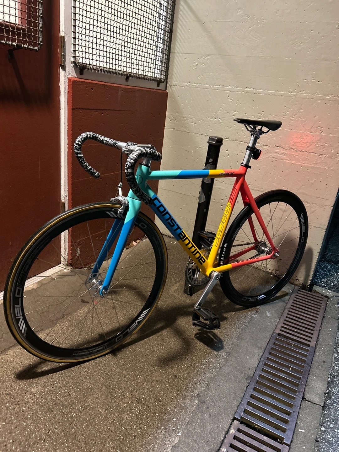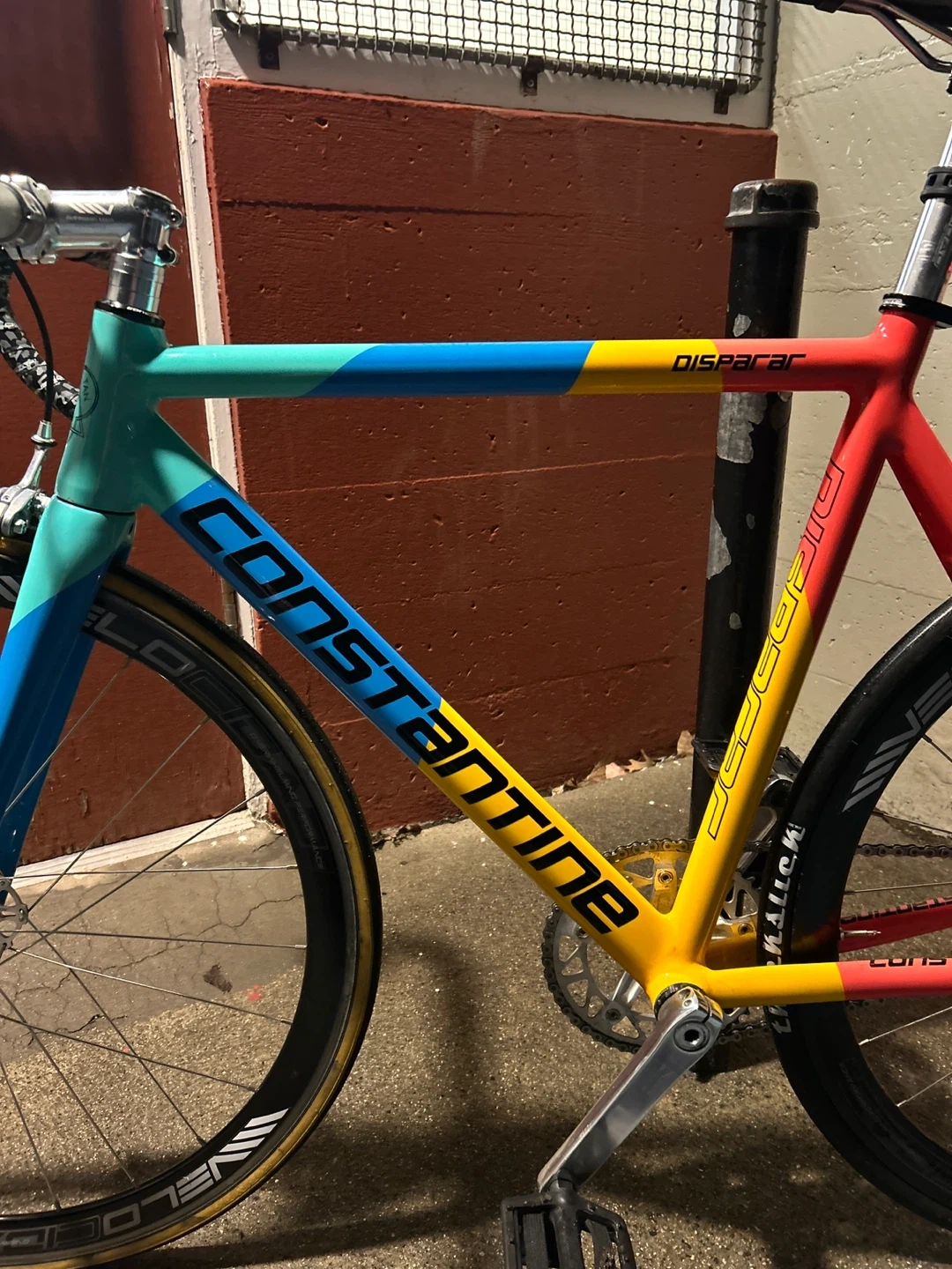 Selling a Constantine Disparar track bike. It has a unique and eye-catching colour scheme that fades from blue to red. The bike is in good condition and ready to ride!