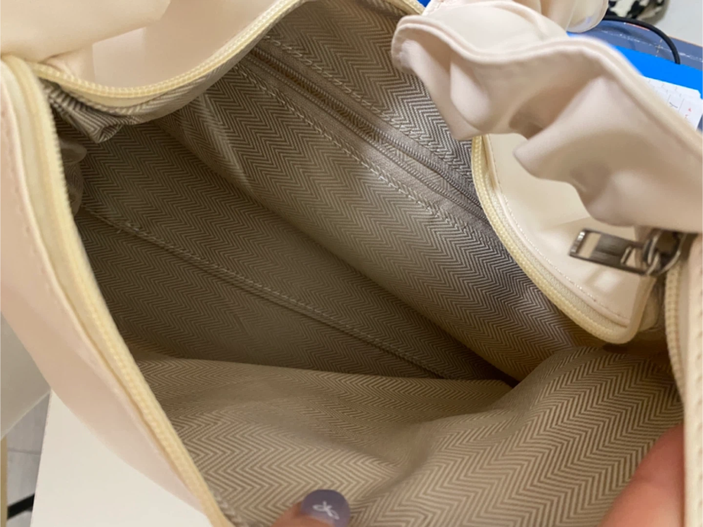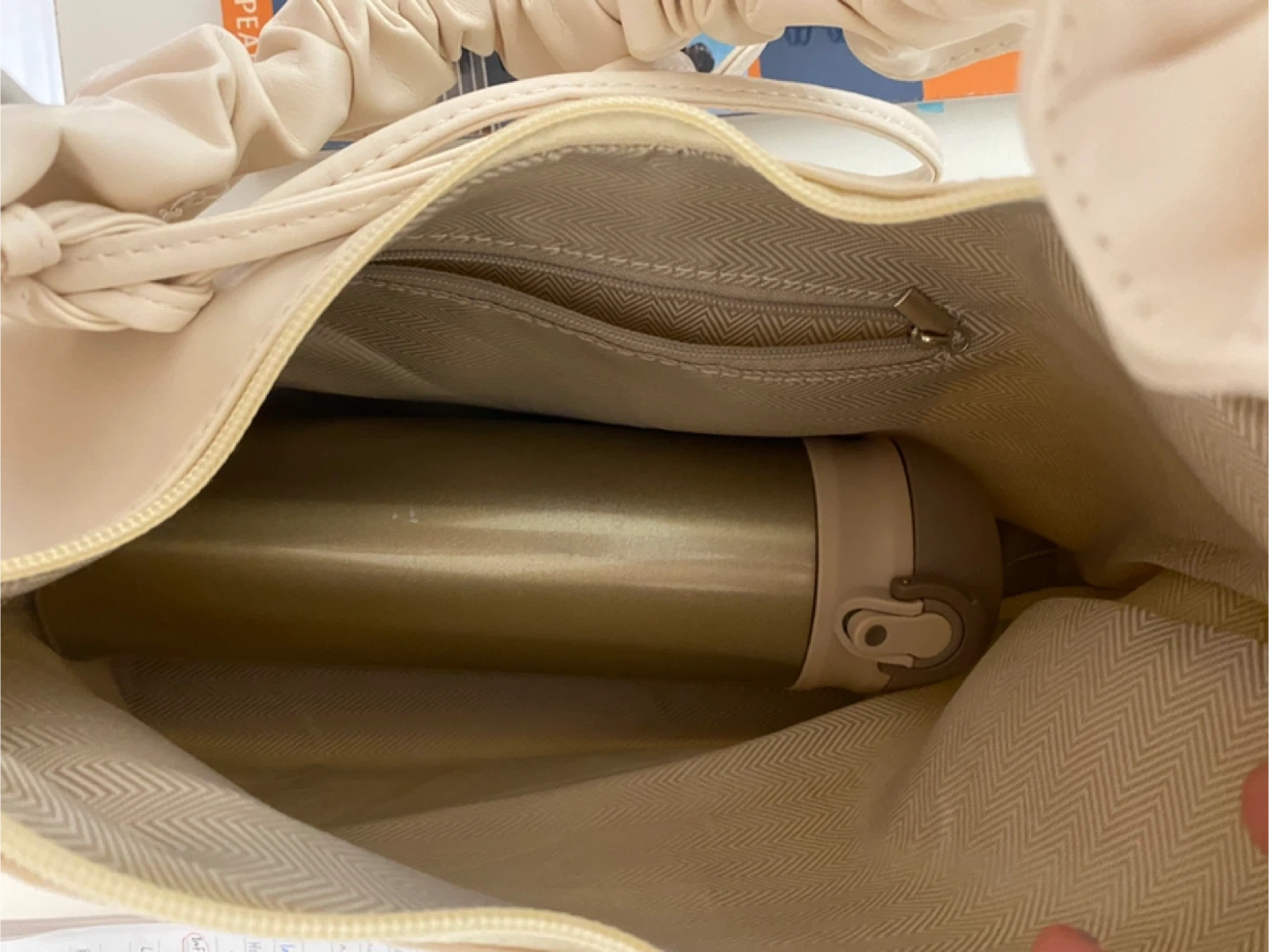 A cute beige bag with a ruched handle! It's in great condition and perfect for carrying your essentials. The interior has a neutral-toned lining with a zippered pocket for extra security. It's a stylish and practical addition to any outfit.