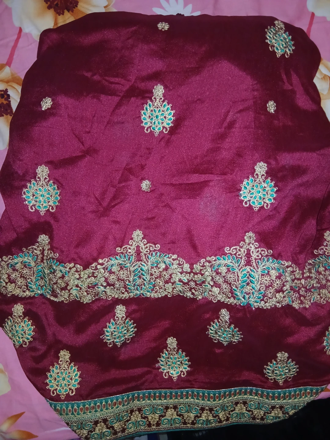 NEED GONE ASAP, dark red saree with gold, green embroidered work