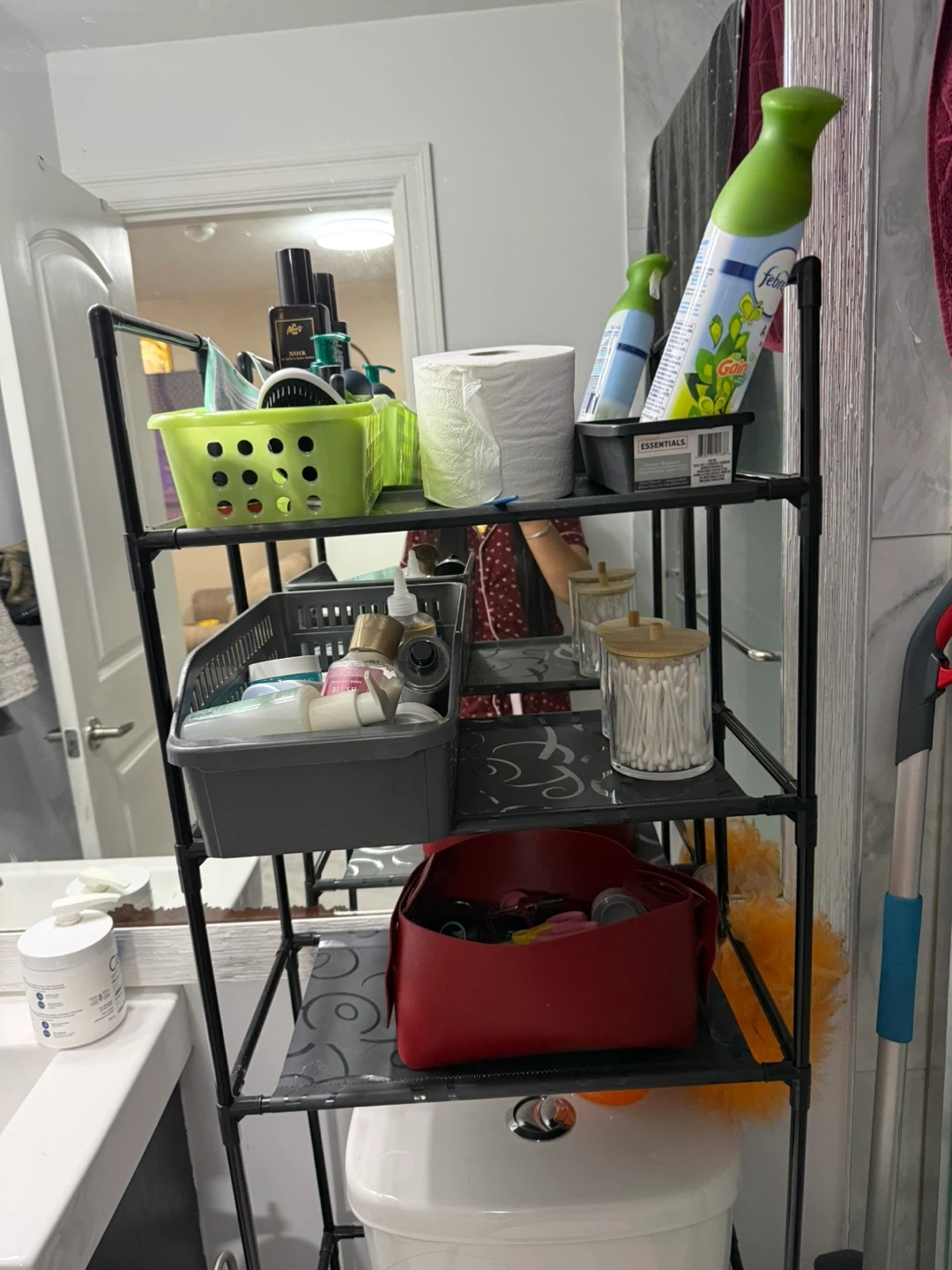 This is a black bathroom shelf unit. It's in great shape and ready to help organize your space. Perfect for over the toilet storage!