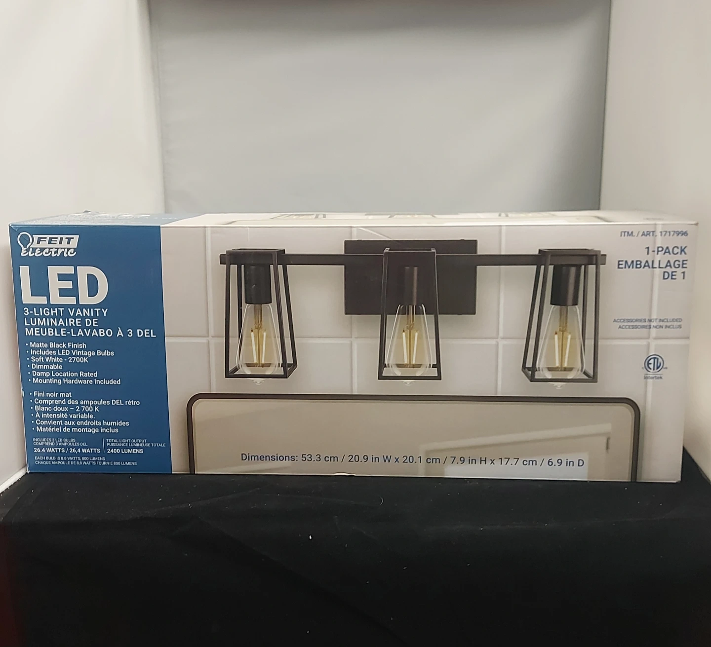 Selling a Feit Electric 3-Light LED Vanity Light in matte black finish. 185 im box & willimg to negotiate. It comes with vintage bulbs and is dimmable. Suitable for damp locations. Mounting hardware is included. The dimensions are 53.3 cm / 20.9 in W x 20.1 cm / 7.9 in H x 17.7 cm / 6.9 in D