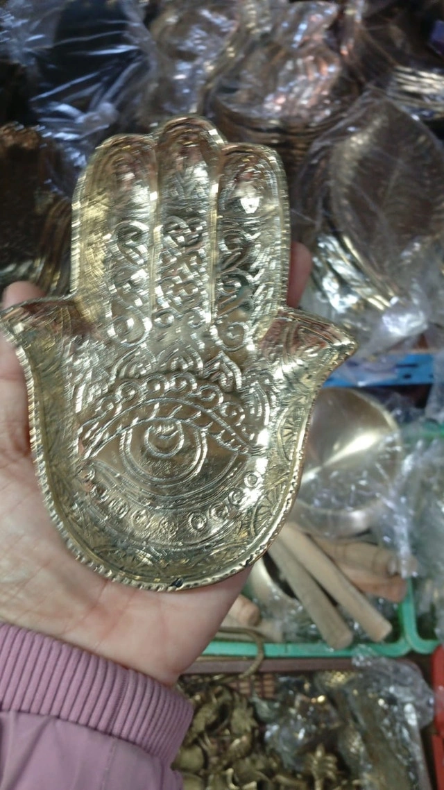 This used, ornate Hamsa hand dish, finished in a bright gold colour and intricate designs, is perfect for adding a touch of worldly charm to any space.