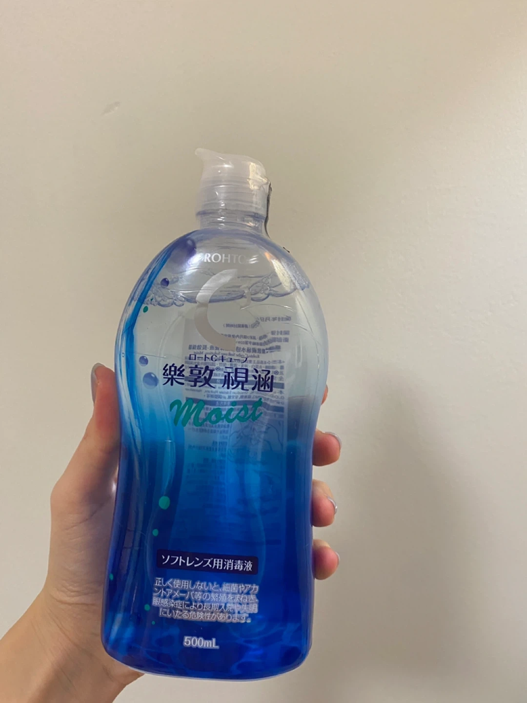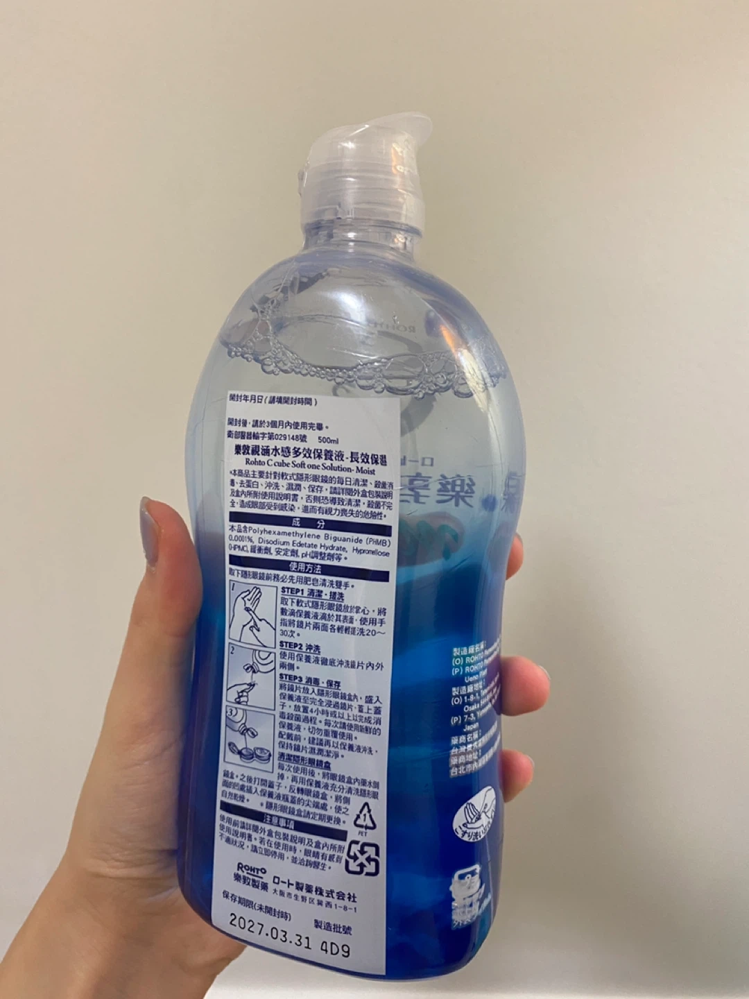 Selling a bottle of Rohto C Cube Soft One Solution Moist. It's a multi-purpose solution for soft contact lenses. The bottle contains 500ml of solution. The expiration date is 2027 March 31