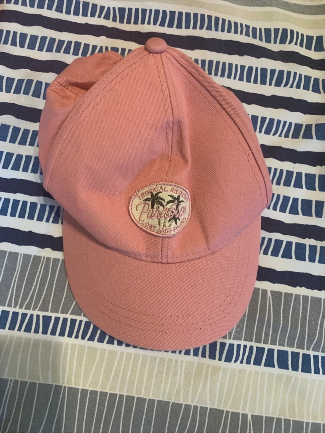 Selling a few baseball caps! There's a pink cap with a 'Tropical Resort Paradise' patch, a black 'London' cap, and a white cap with 'Your Favorite Obsession' embroidered on it. They're all in great shape and ready for a new adventure
