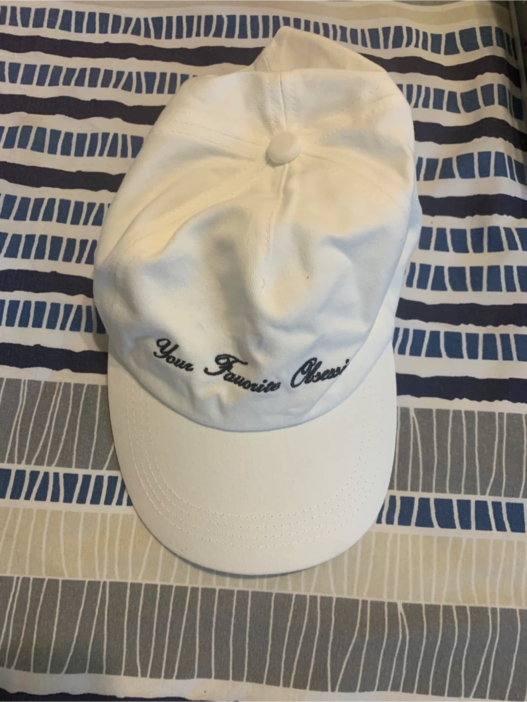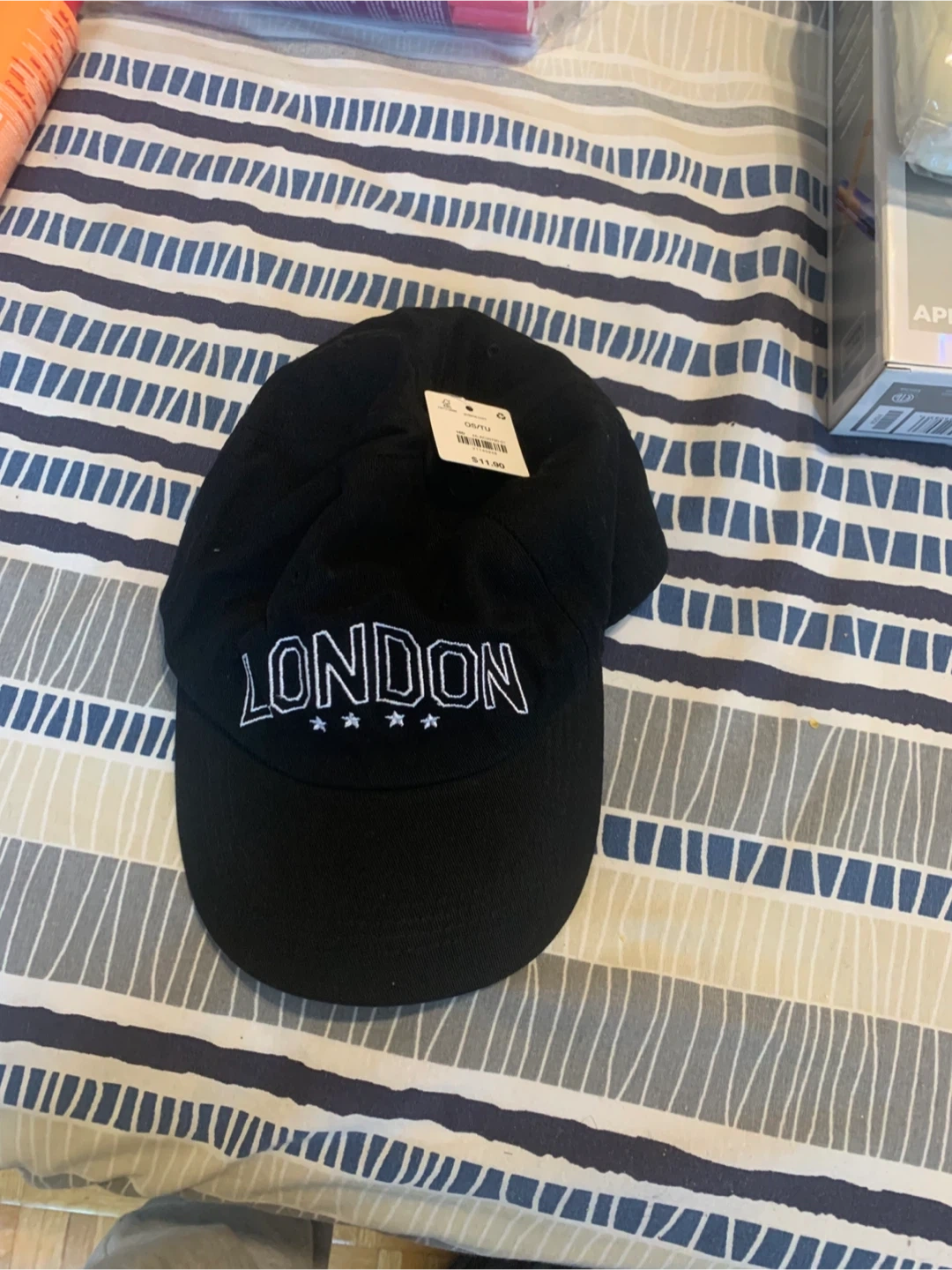 Selling a few baseball caps! There's a pink cap with a 'Tropical Resort Paradise' patch, a black 'London' cap, and a white cap with 'Your Favorite Obsession' embroidered on it. They're all in great shape and ready for a new adventure
