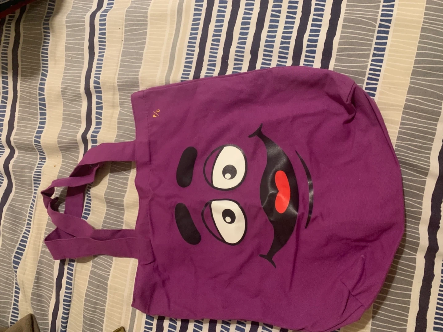 Selling a fun purple tote bag featuring Grimace from President's Choice! It's in great condition and perfect for carrying groceries or everyday items around town
