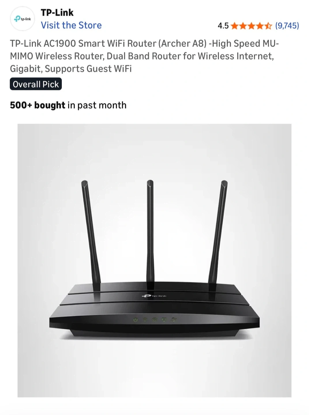 Selling a TP-Link AC1900 Smart WiFi Router (Archer A8). It's a high-speed MU-MIMO Wireless Router, Gigabit, and supports Dual Band Router for Wireless Internet. It's OneMesh compatible and forms a seamless WiFi when working with TP-Link OneMesh WiFi Extenders. Wave 2 Wireless Internet Router, 600 Mbps on the 2.4GHz band and 1300 Mbps on the 5GHz band. Full Gigabit Ports create fast, reliable wired connections for your PCs, Smart TVs, and gaming console with 4 x Gigabit LAN and 1 x Gigabit WAN. Works wonderfully with my Spectrum modem at speeds up to 121%. Please see photos, power cord included but recycled the box.