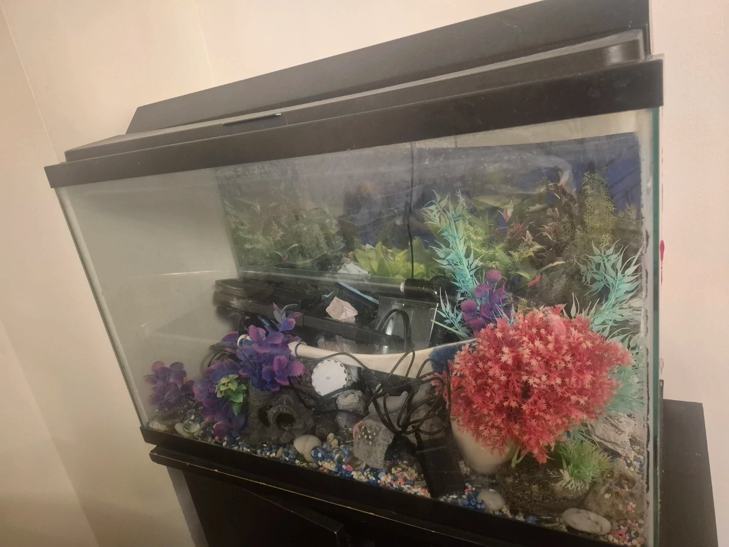 Selling a used fish tank, complete with accessories. It's all set up and ready to go for your aquatic friends. Includes gravel, decorative plants, and a filter system.