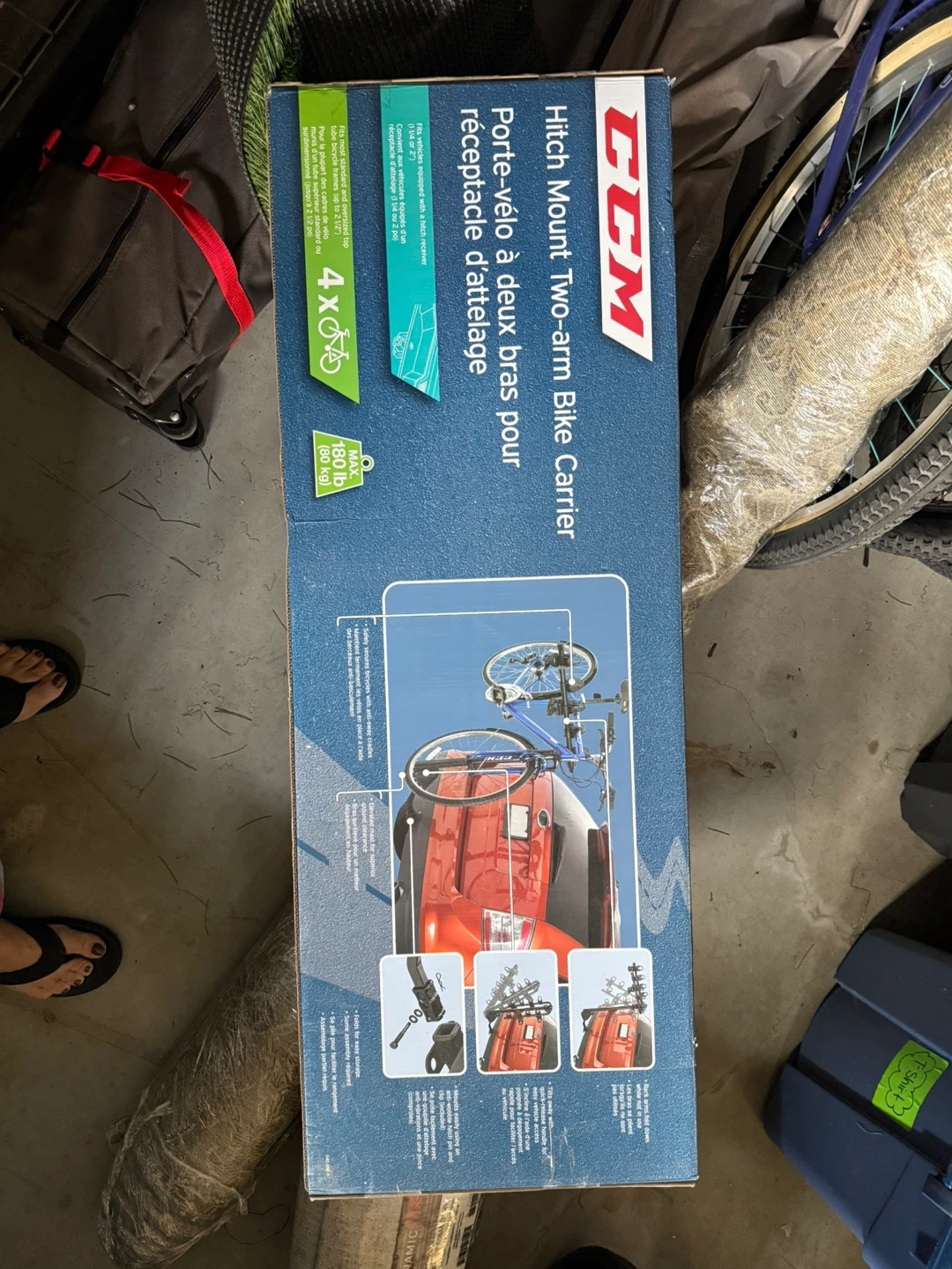 Selling a CCM Hitch Mount Two-arm Bike Carrier. It fits vehicles equipped with a hitch receiver (1 1/4 or 2") and most standard and oversized tube bicycle frames (up to 2 1/2"). It can carry up to 4 bikes with a max weight of 180 lb (80 kg). Some assembly is required.