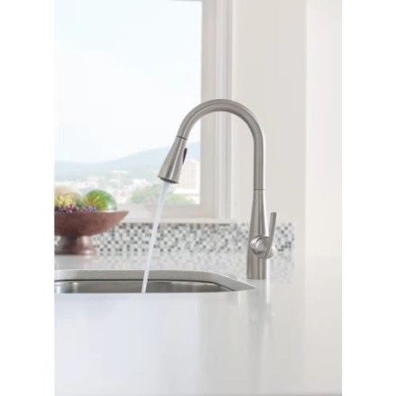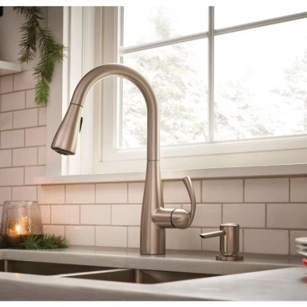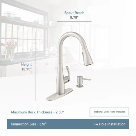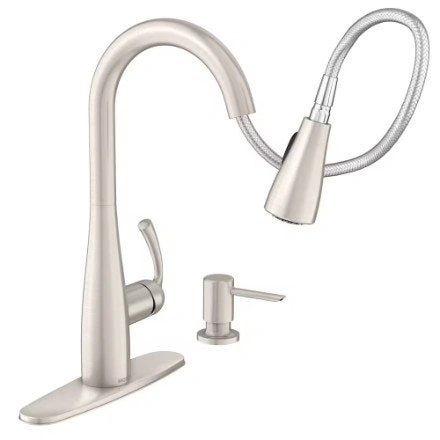 Brand new sealed MOEN Essie pull-down kitchen faucet/tap with soap dispenser in spot-resistant stainless steel. Model 87014SRS. Style meets functionality in the Essie pull-down sprayer kitchen faucet from MOEN, boasting transitional design appeal while showcasing several of MOEN's top innovative features. Essie utilizes Reflex technology and Powerclean technology that delivers 50% more spray power. Spot Resist stainless finish resists fingerprints and water spots. Equipped with the Reflex system for smooth operation, easy movement, and secure docking of the pull-down spray head. Features Duralock quick connect system for easy installation. Pull-down design offers at-your-fingertips water delivery. Optional soap/lotion dispenser and deck plate (escutcheon) included for a 1, 2, 3, or 4-hole sink configuration. Deck plate included.