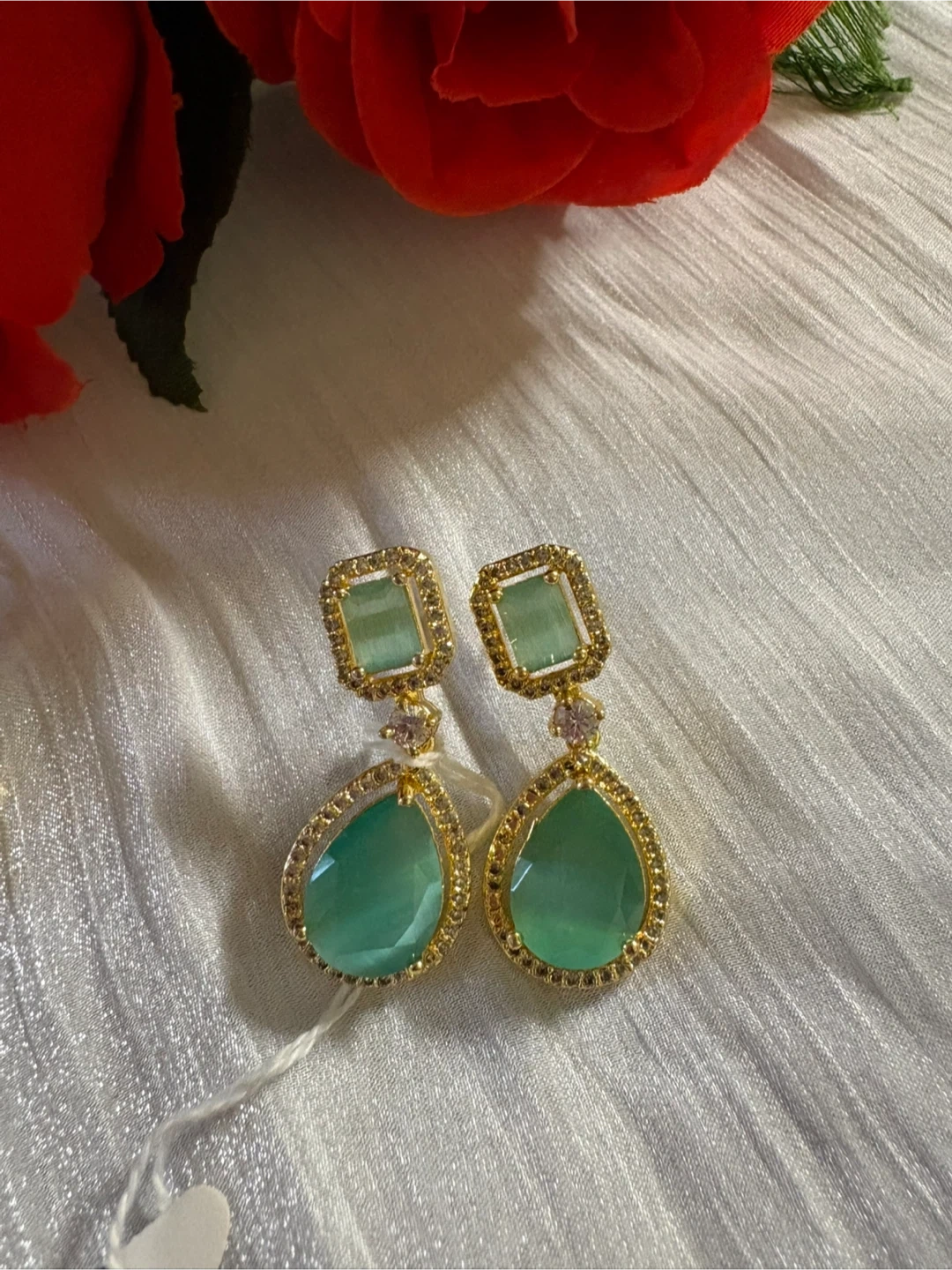 These are a pair of beautiful drop earrings with a gold setting and green stones. They are in great condition and would make a lovely addition to any outfit!