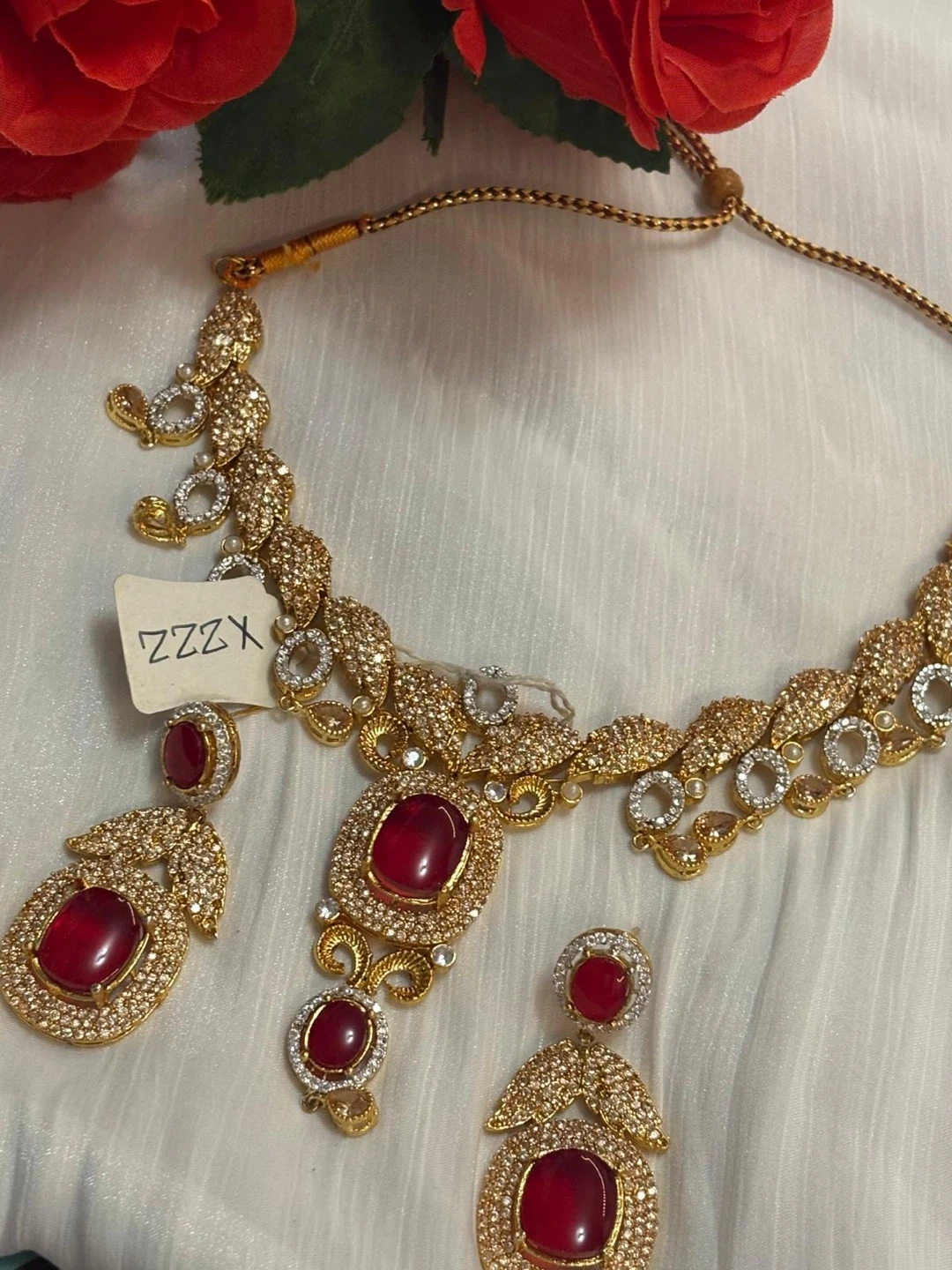 Beautiful red and gold necklace with matching earrings! This set is perfect for adding a touch of elegance to any outfit. The intricate detailing and vibrant colours make it a standout piece