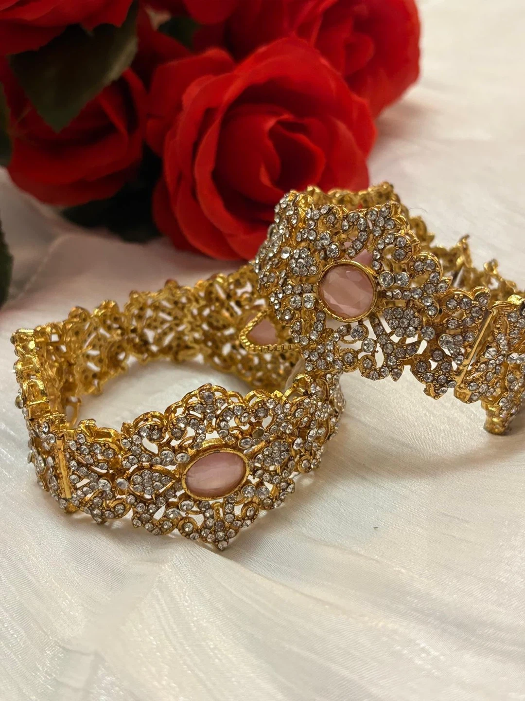 These are a pair of beautiful gold tone bangle bracelets. They feature an intricate design with rhinestones and a pink oval stone in the center. Perfect for adding a touch of elegance to any outfit!
