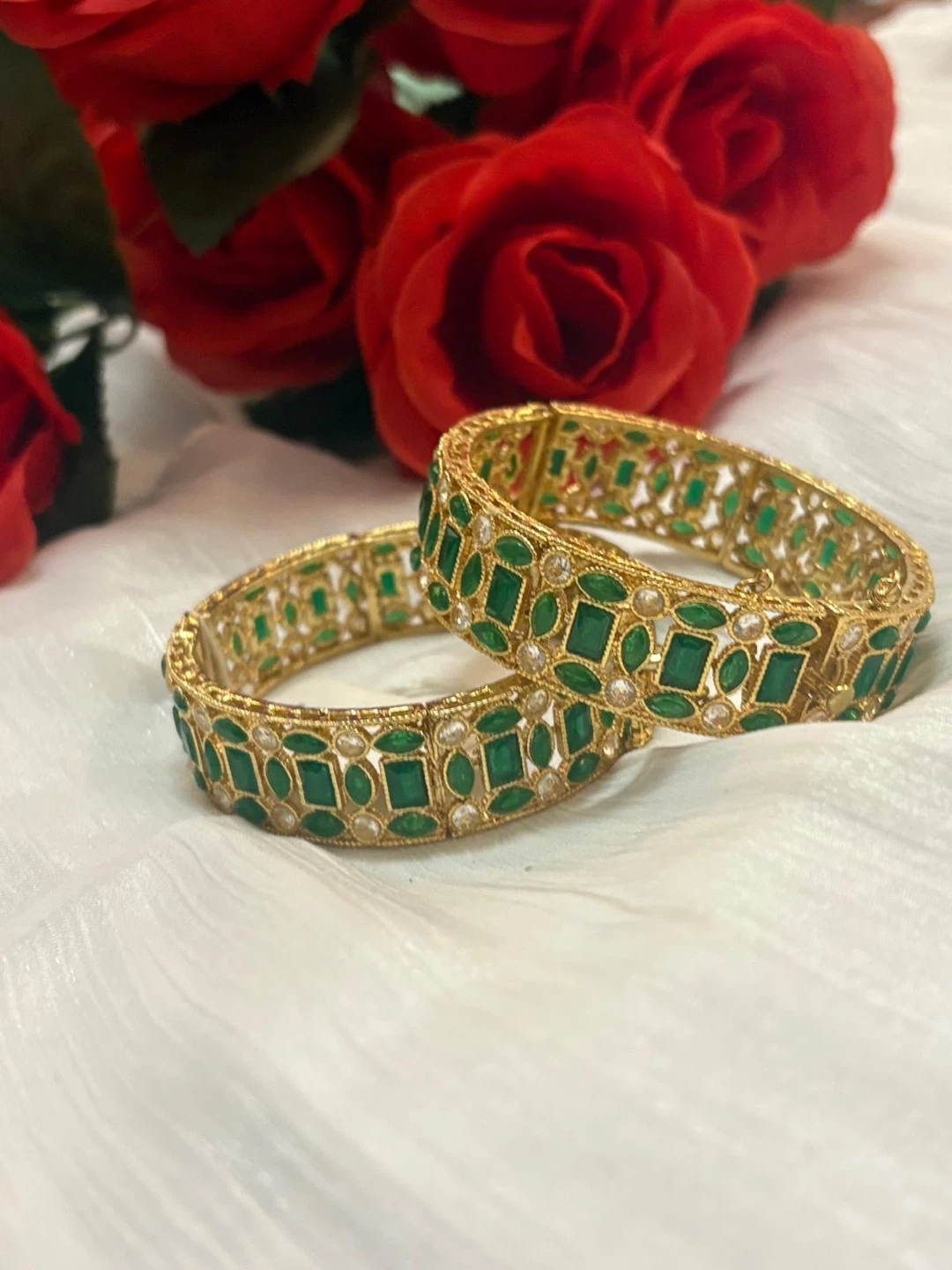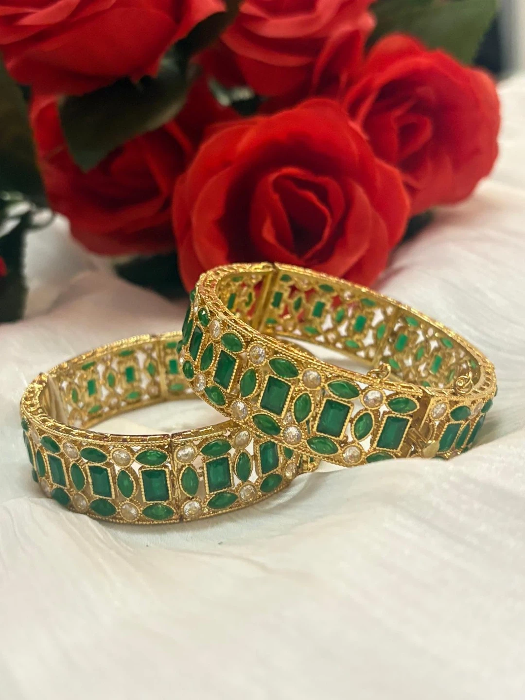 Selling a beautiful set of two emerald and gold bangles! These bangles feature a detailed design with green emerald-like stones and gold-tone metal. They're perfect for adding a touch of elegance to any outfit. They are in great condition and ready for a new owner!