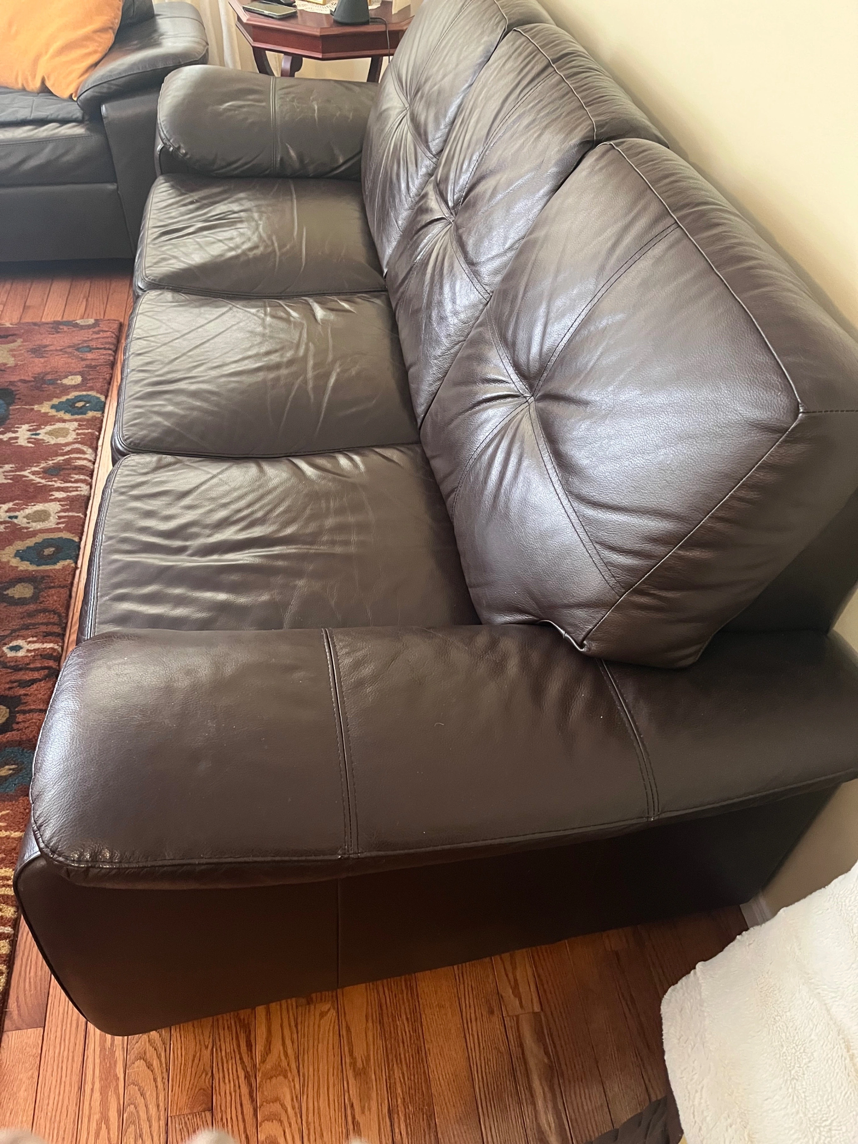 Two available: Three-seater dark brown leather sofa/couch