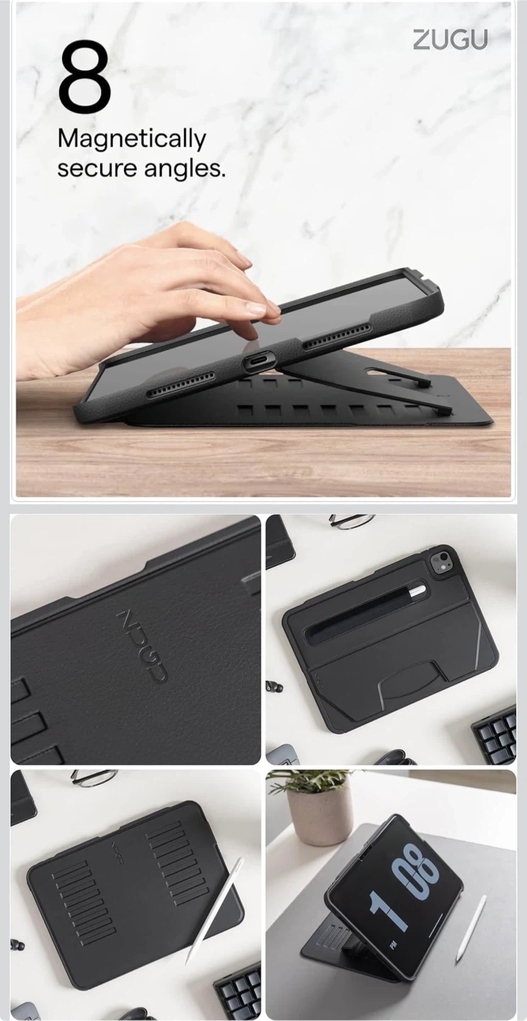 Selling a Pencil and Zugu Case for an 11-inch iPad Pro in black. This case is designed for stability and has 7+ adjustable angles. It's positively magnetic, allowing it to attach to any metallic surface for easy hands-free use. It also features cool air ventilation to keep your device cool and provides 5ft drop protection. There are also 2 Apple Pencil holders to keep your stylus on point and online