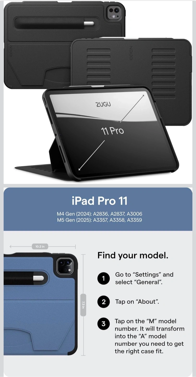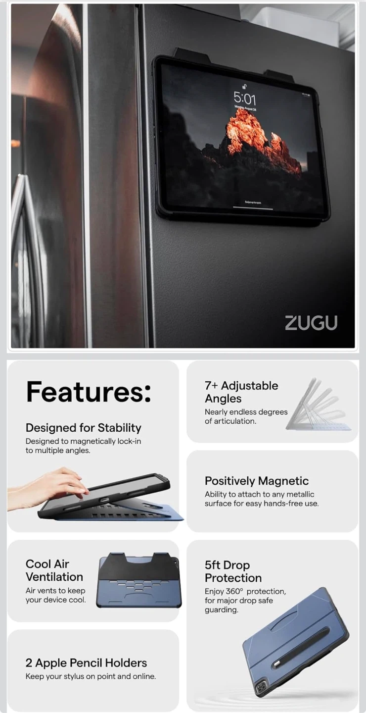 Selling a Pencil and Zugu Case for an 11-inch iPad Pro in black. This case is designed for stability and has 7+ adjustable angles. It's positively magnetic, allowing it to attach to any metallic surface for easy hands-free use. It also features cool air ventilation to keep your device cool and provides 5ft drop protection. There are also 2 Apple Pencil holders to keep your stylus on point and online