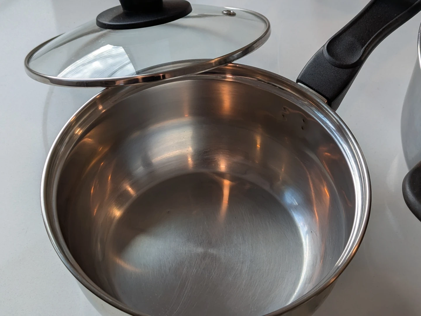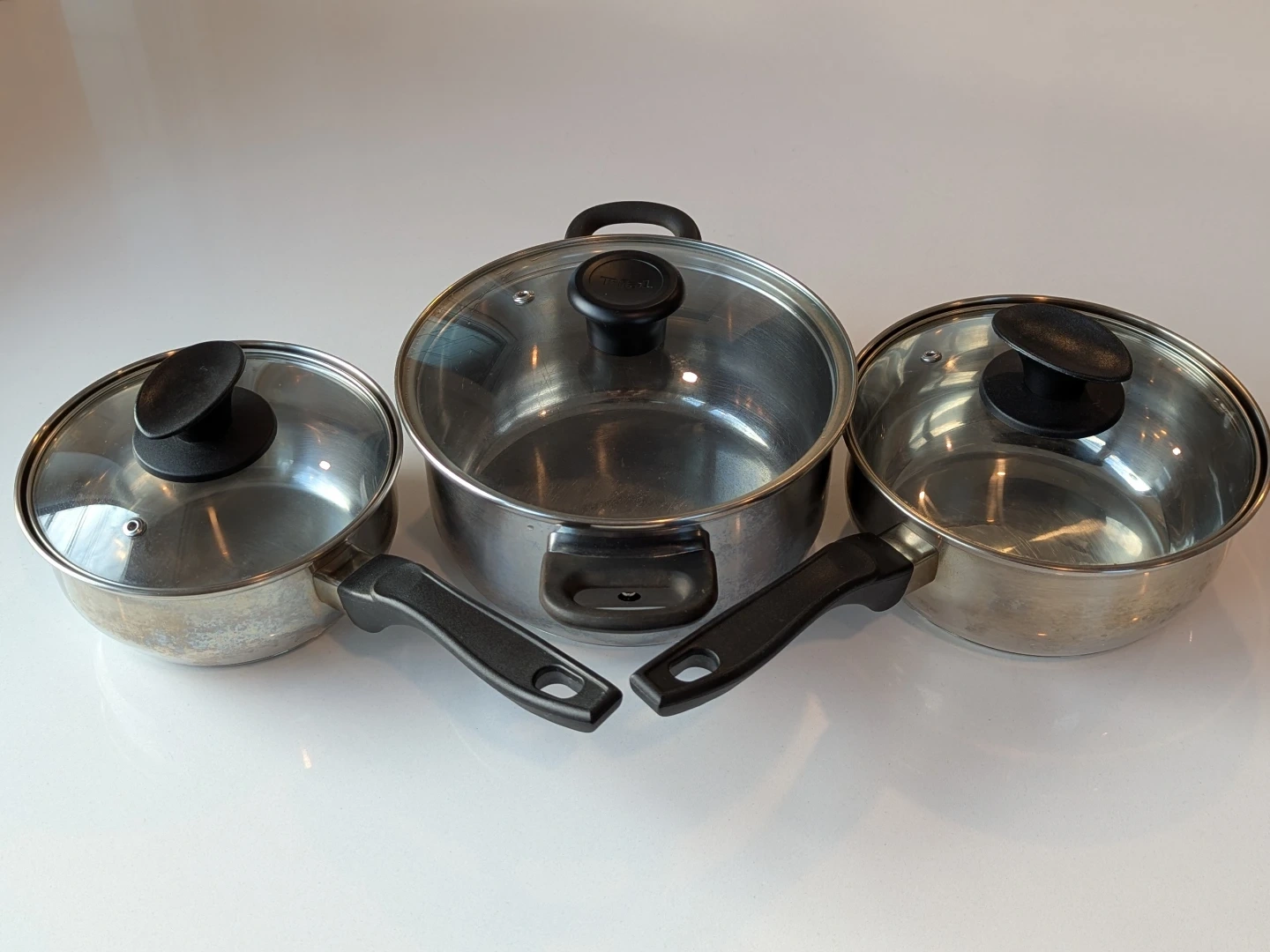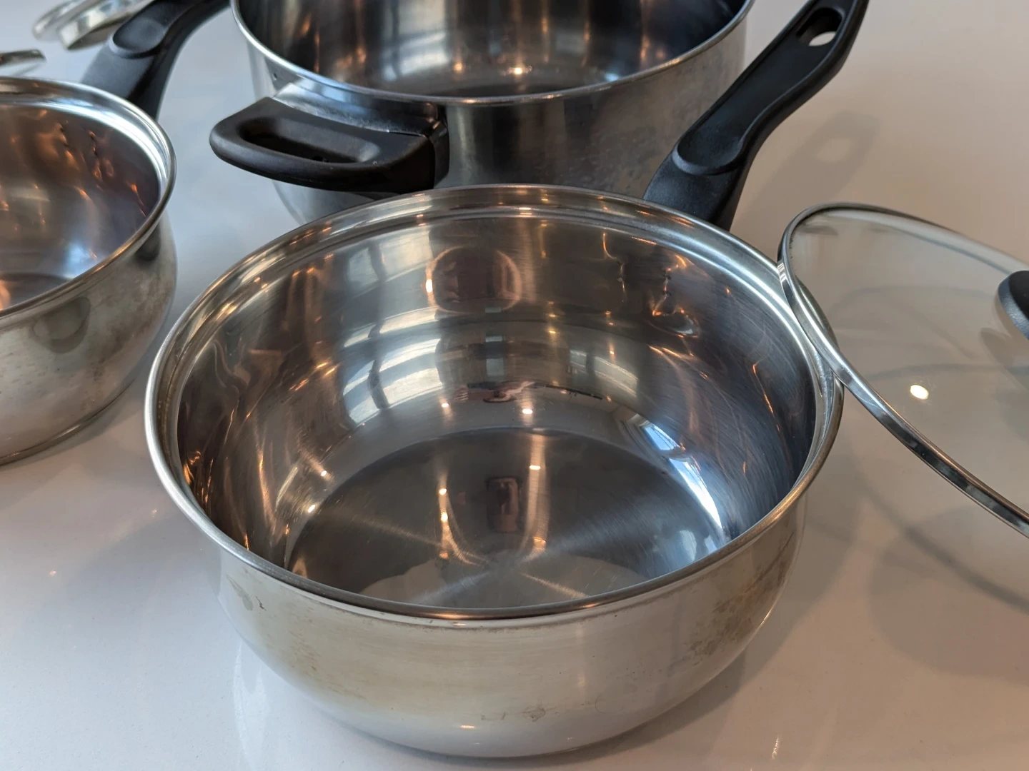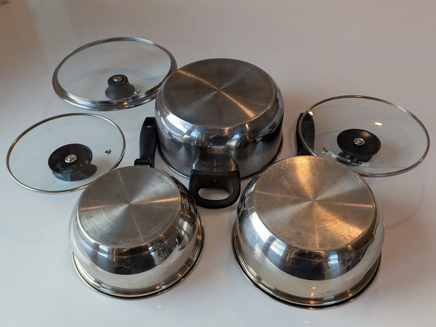 Selling a set of 3 used stainless steel pots. They're in good condition and ready for a new kitchen! Includes the original glass lids
