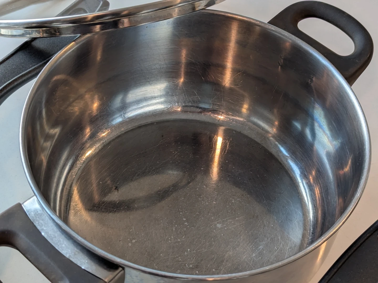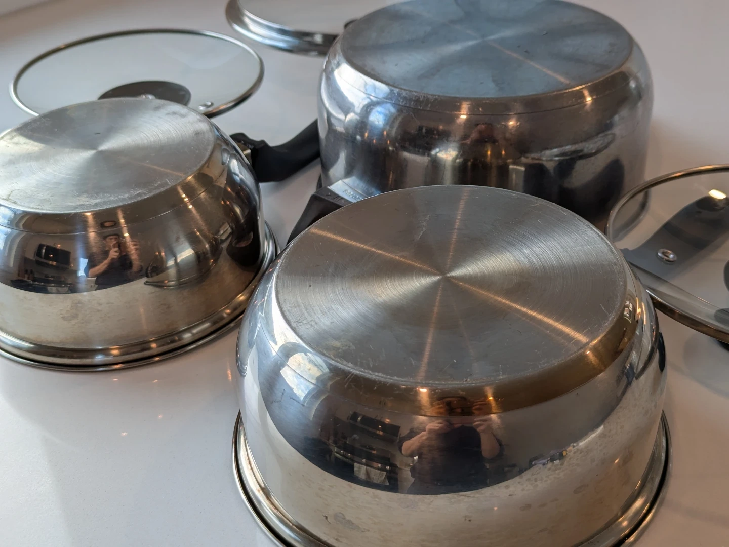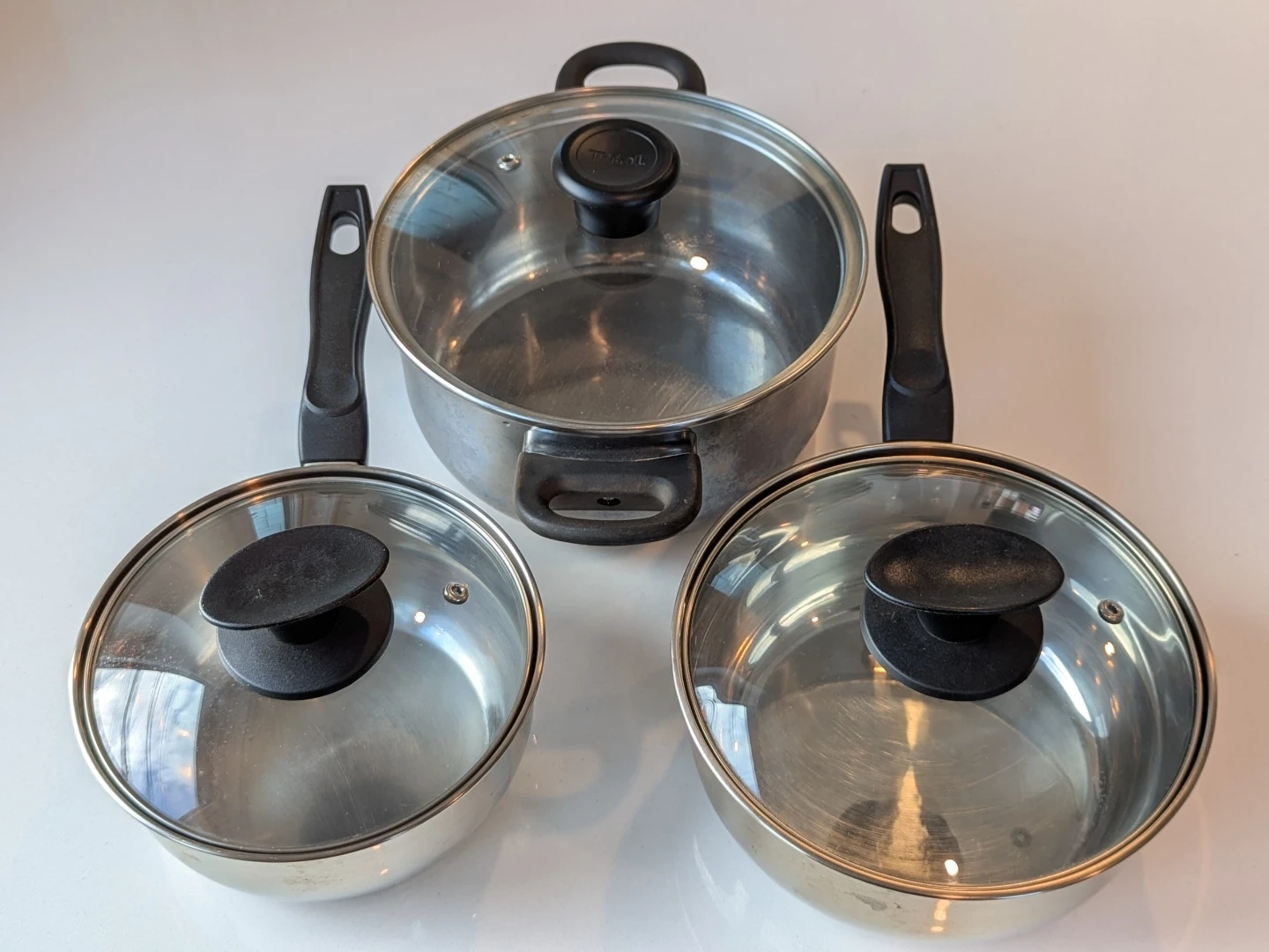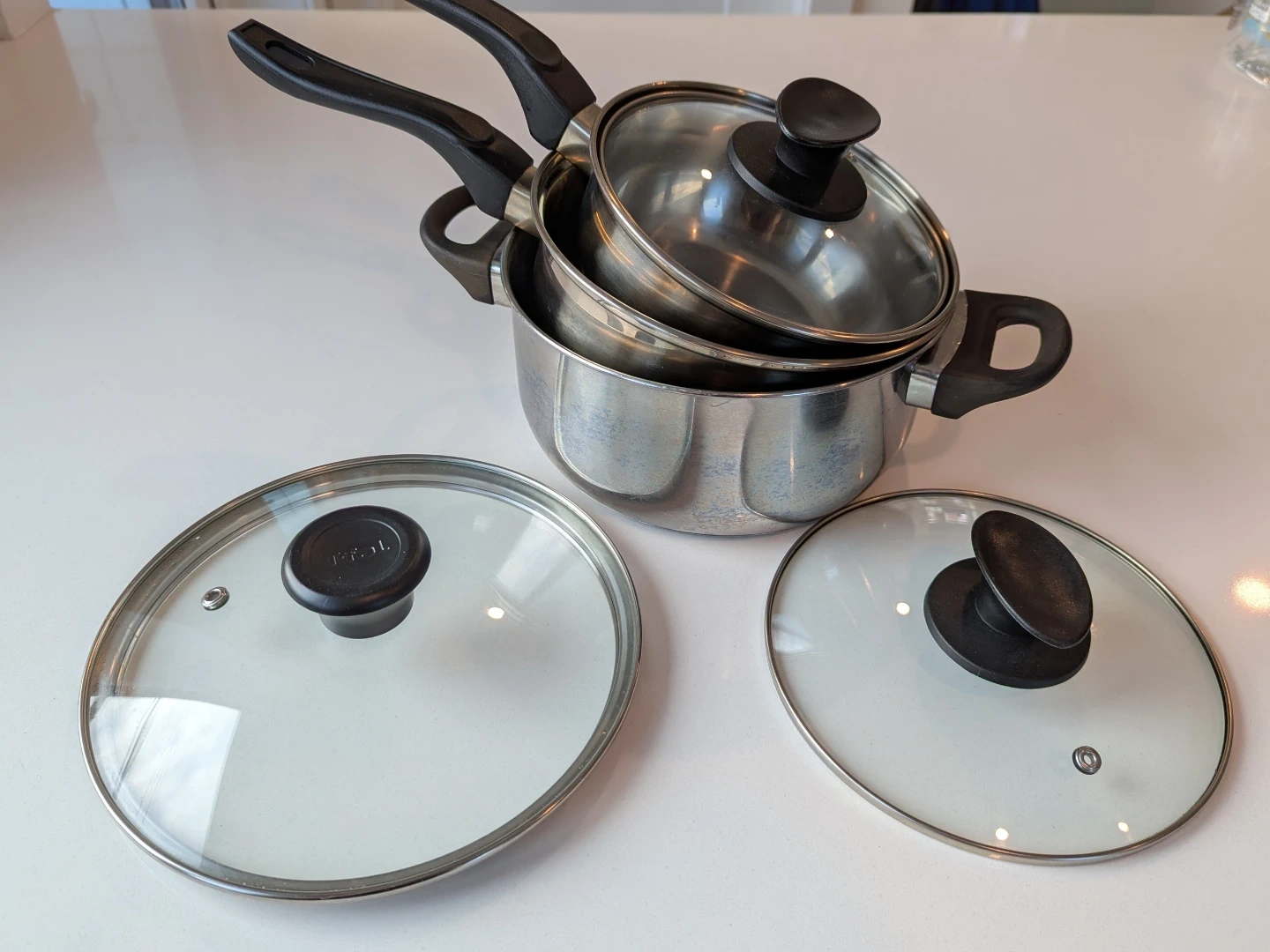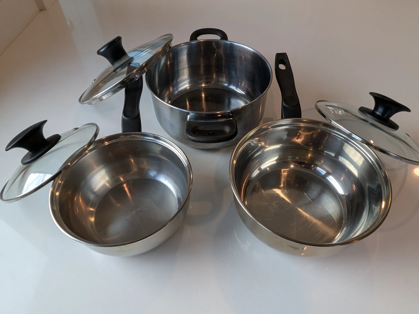 Selling a set of 3 used stainless steel pots. They're in good condition and ready for a new kitchen! Includes the original glass lids