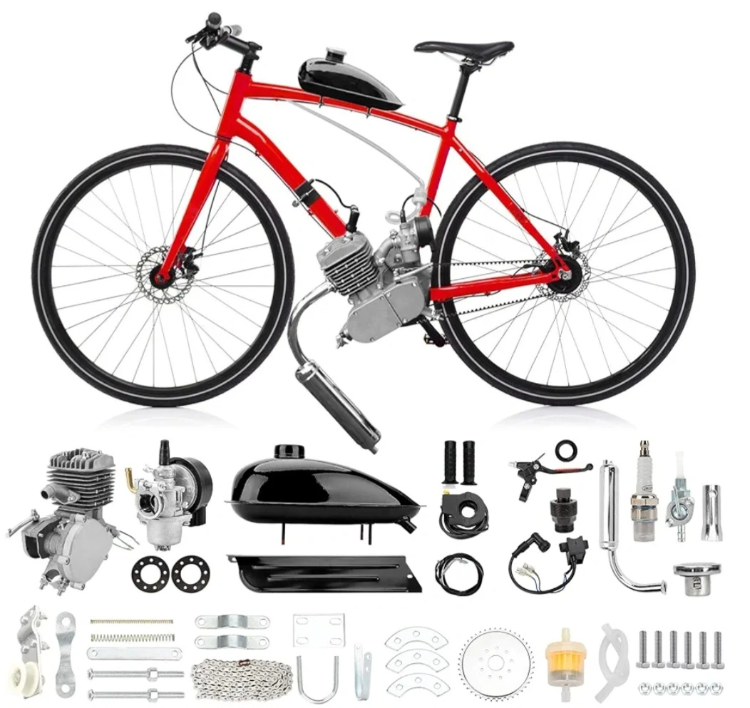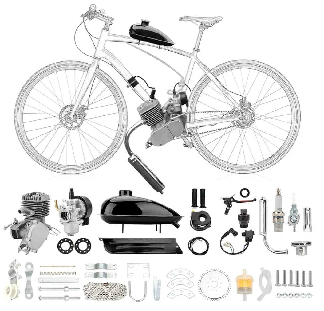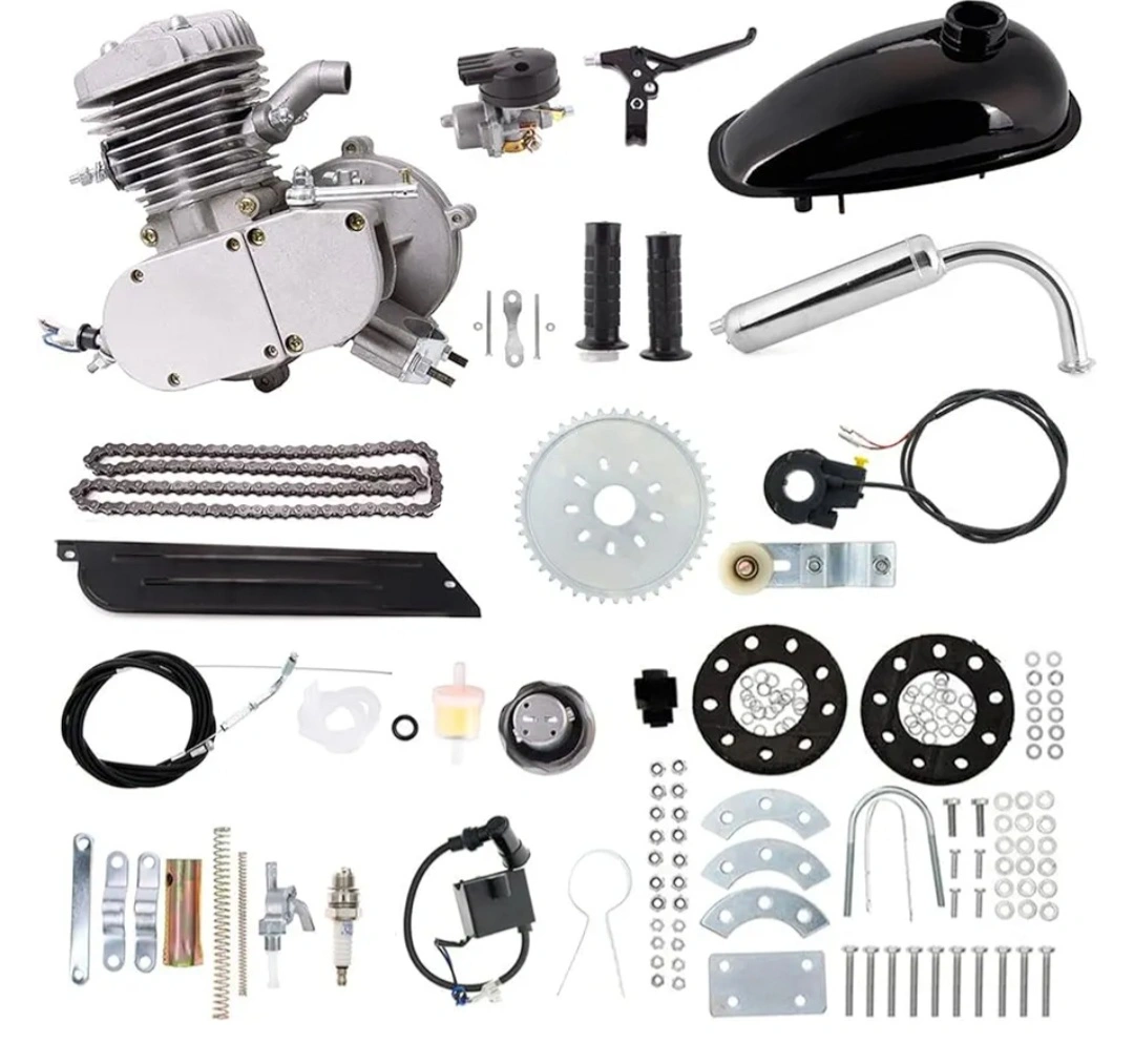 Complete 80cc 2-stroke bicycle engine kit. Includes fuel tank, carburetor, engine, chain, sprockets, and all necessary hardware. Easy installation. Premium gasoline required. Mix fuel and oil before adding to the tank.