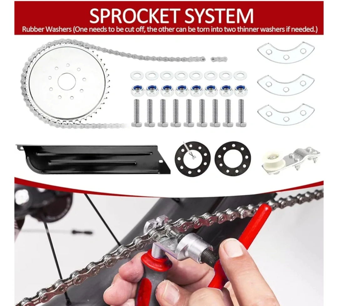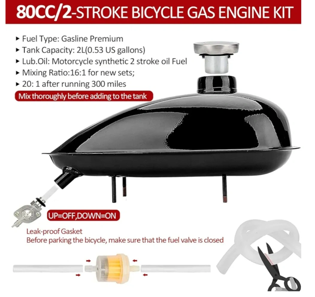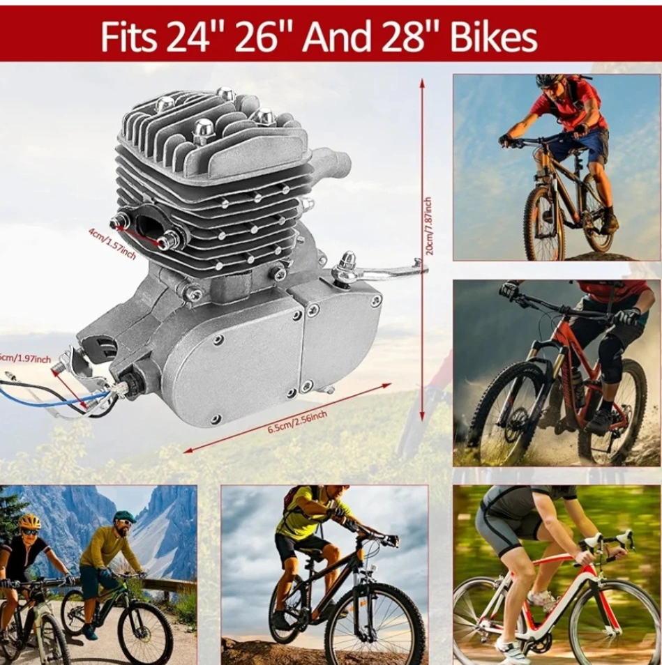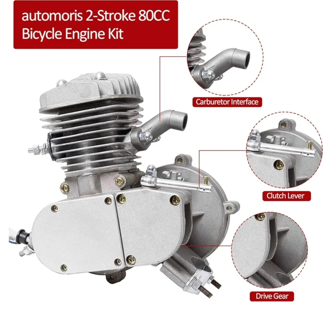 Complete 80cc 2-stroke bicycle engine kit. Includes fuel tank, carburetor, engine, chain, sprockets, and all necessary hardware. Easy installation. Premium gasoline required. Mix fuel and oil before adding to the tank.