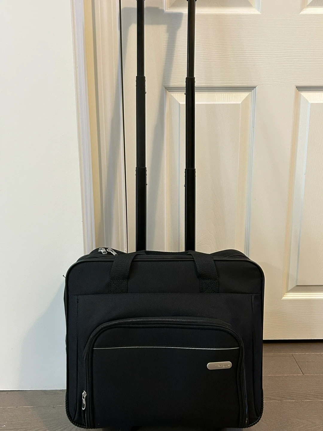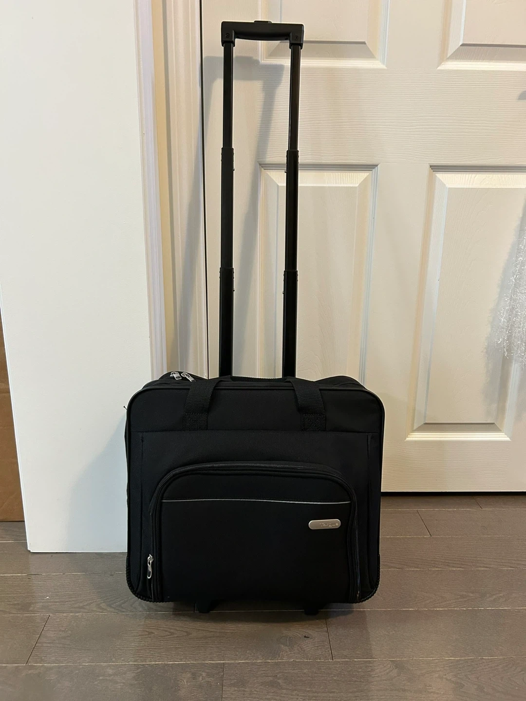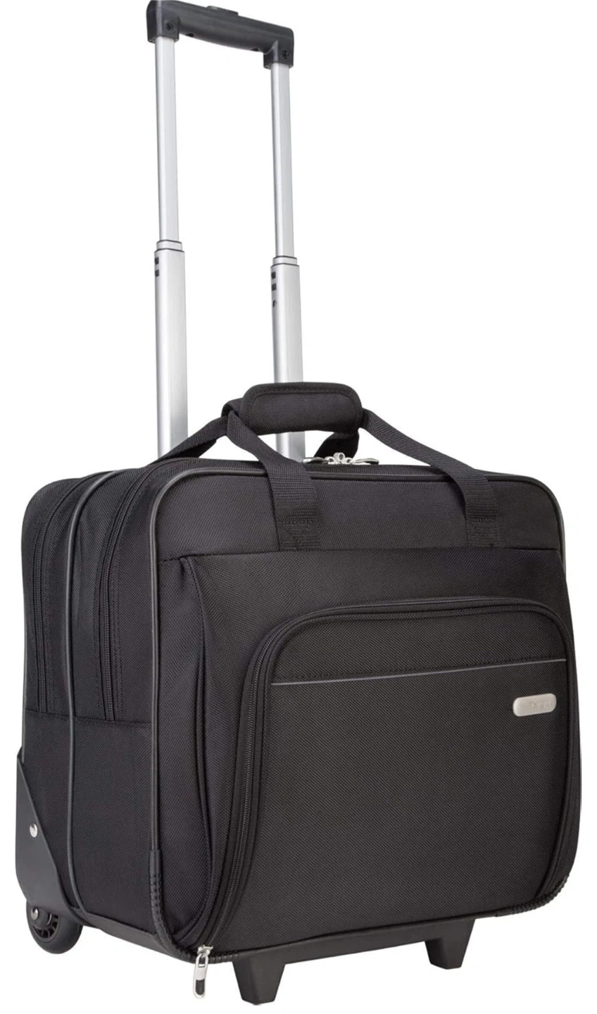 This rolling tote is perfect for travel or work! It's in great shape and ready for a new adventure. The black colour is sleek and professional, and it's super convenient with its rolling design.