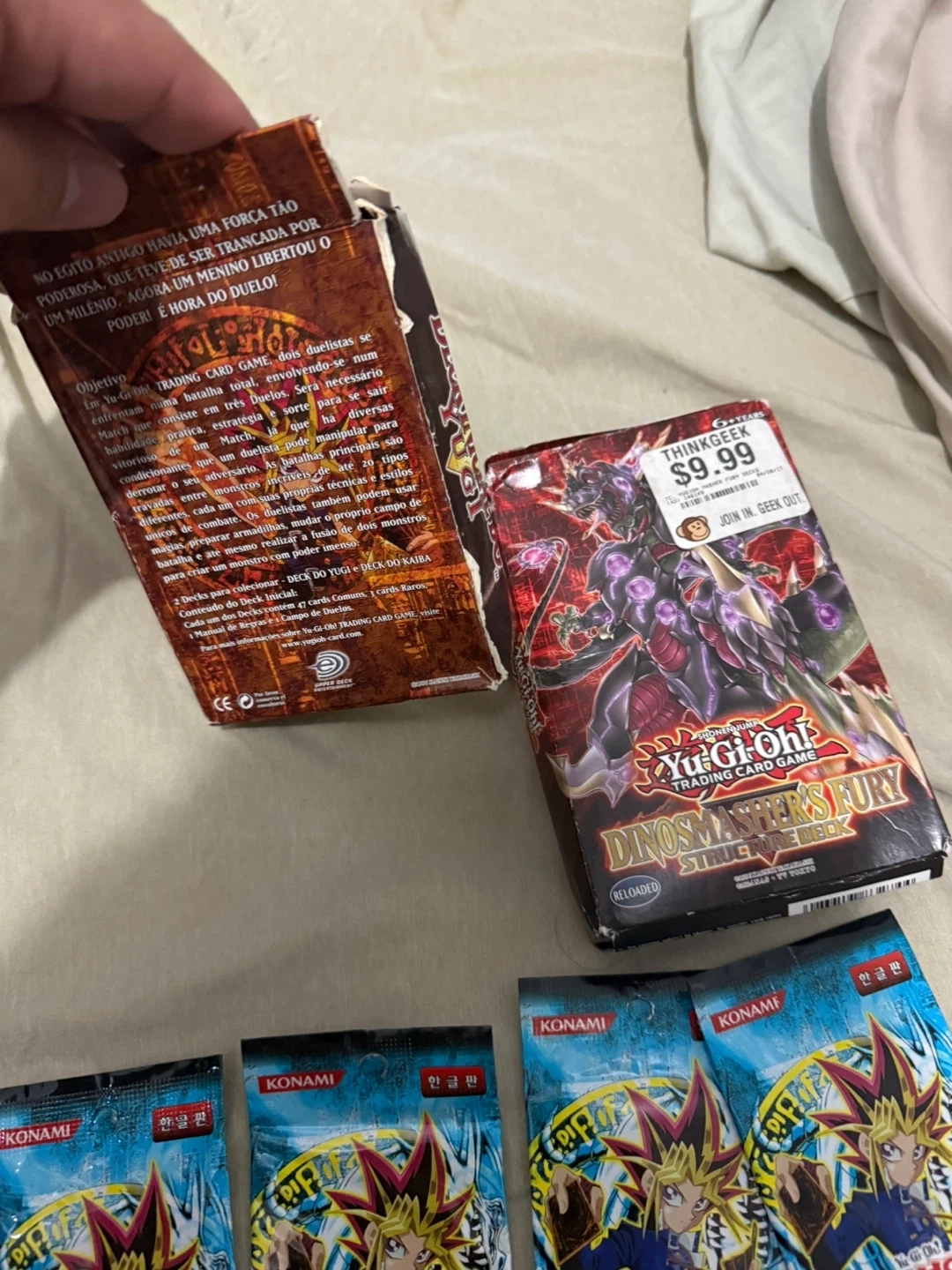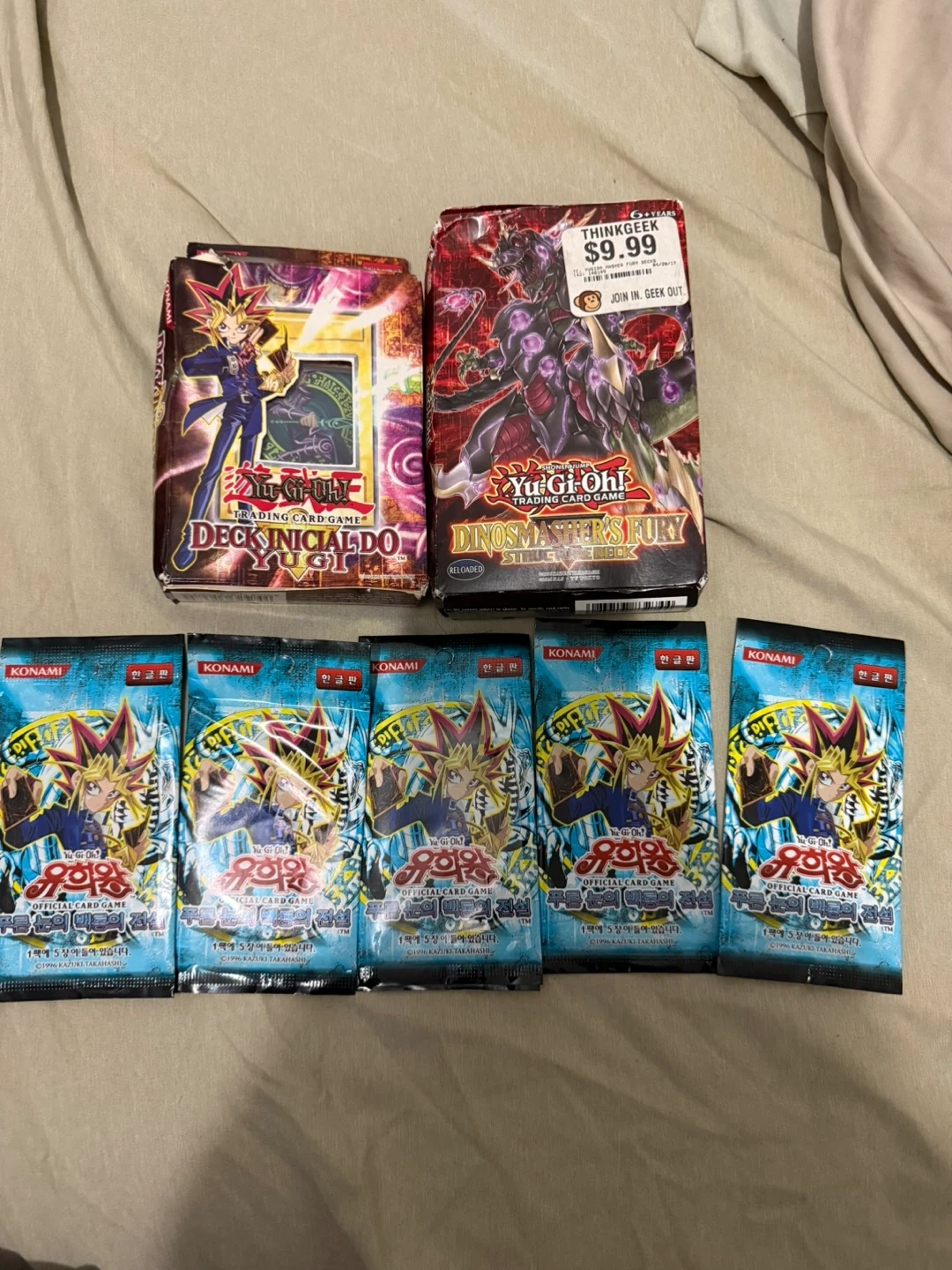 Selling a lot of Yu-Gi-Oh! Trading Card Games. Includes Yugis Deck 1st Edition in Portuguese and Dino Fury Deck en English a some legend of blue eyes booster packs in Korean/Japanese not sure.