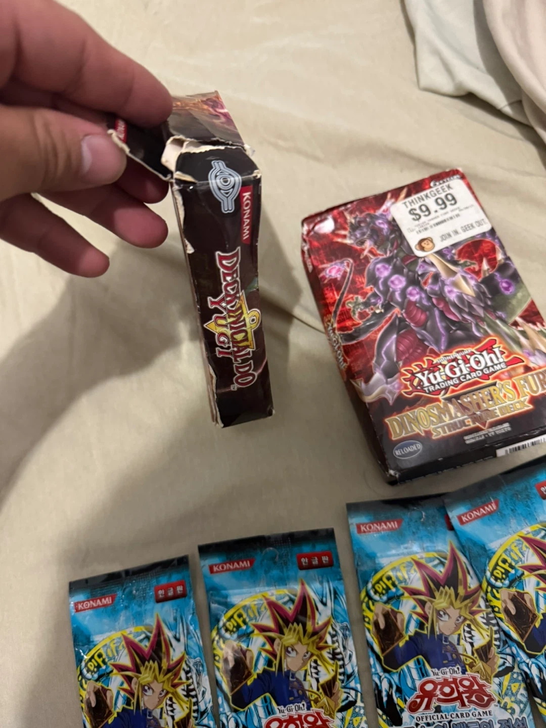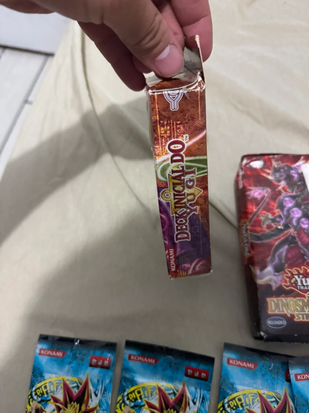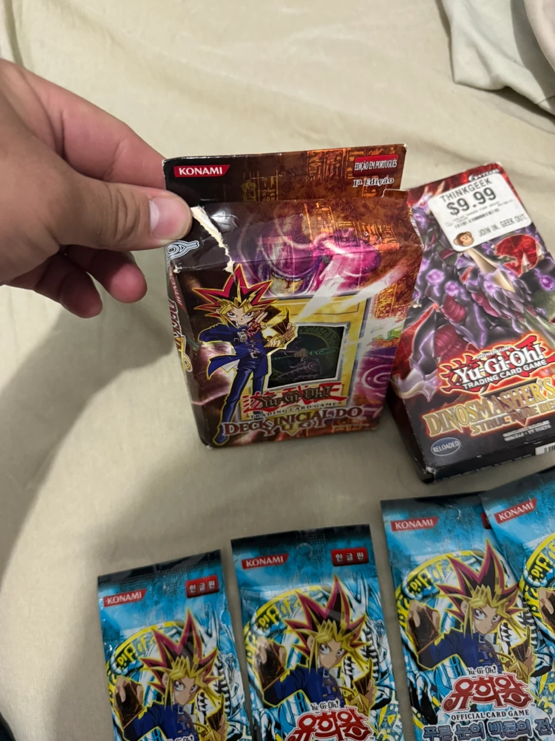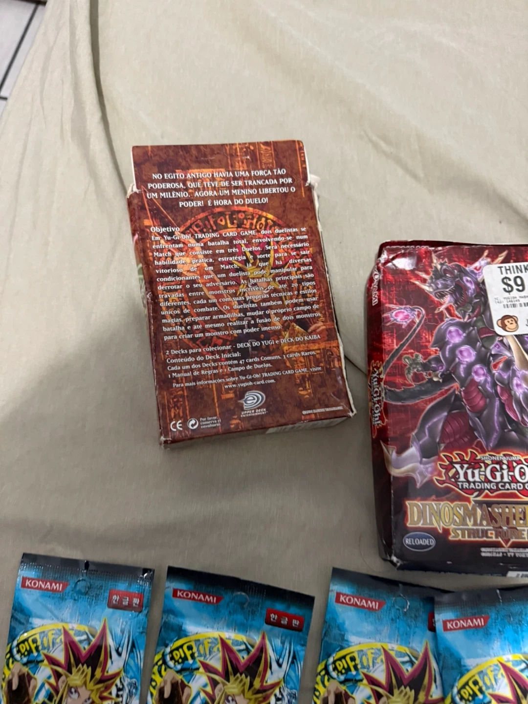 Selling a lot of Yu-Gi-Oh! Trading Card Games. Includes Yugis Deck 1st Edition in Portuguese and Dino Fury Deck en English a some legend of blue eyes booster packs in Korean/Japanese not sure.